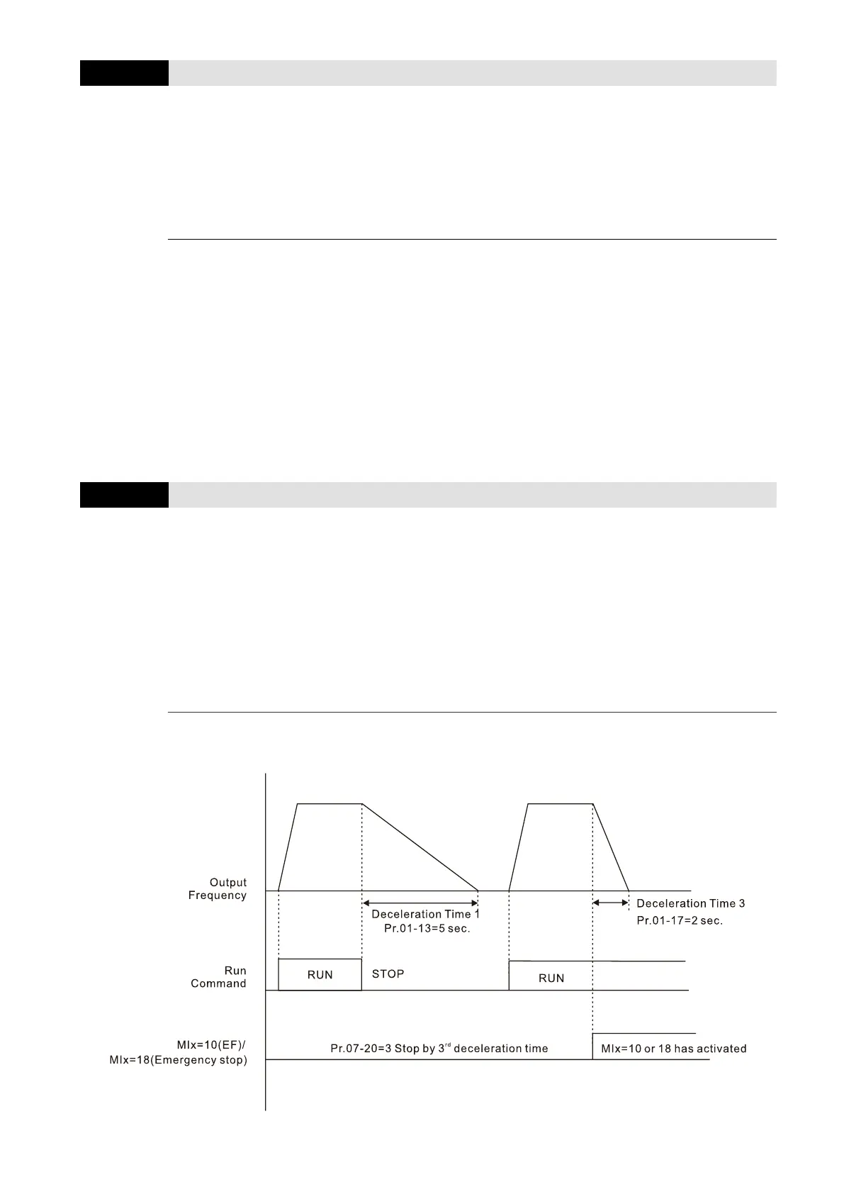 When the multi-function input terminal setting is set to 10 (EF input) or 18 (force to stop) and the