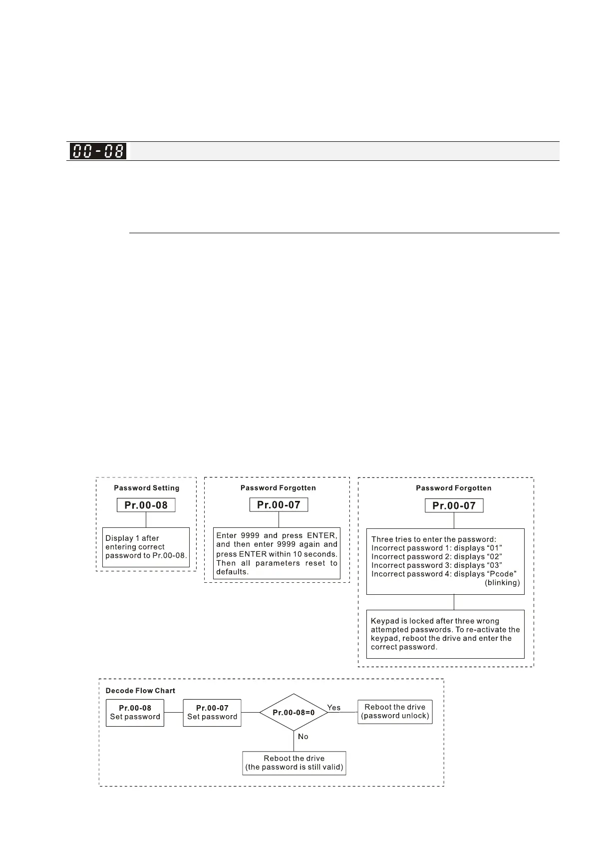 permanently deactivate password protection, set Pr.00-08 to 0 manually. Otherwise, password