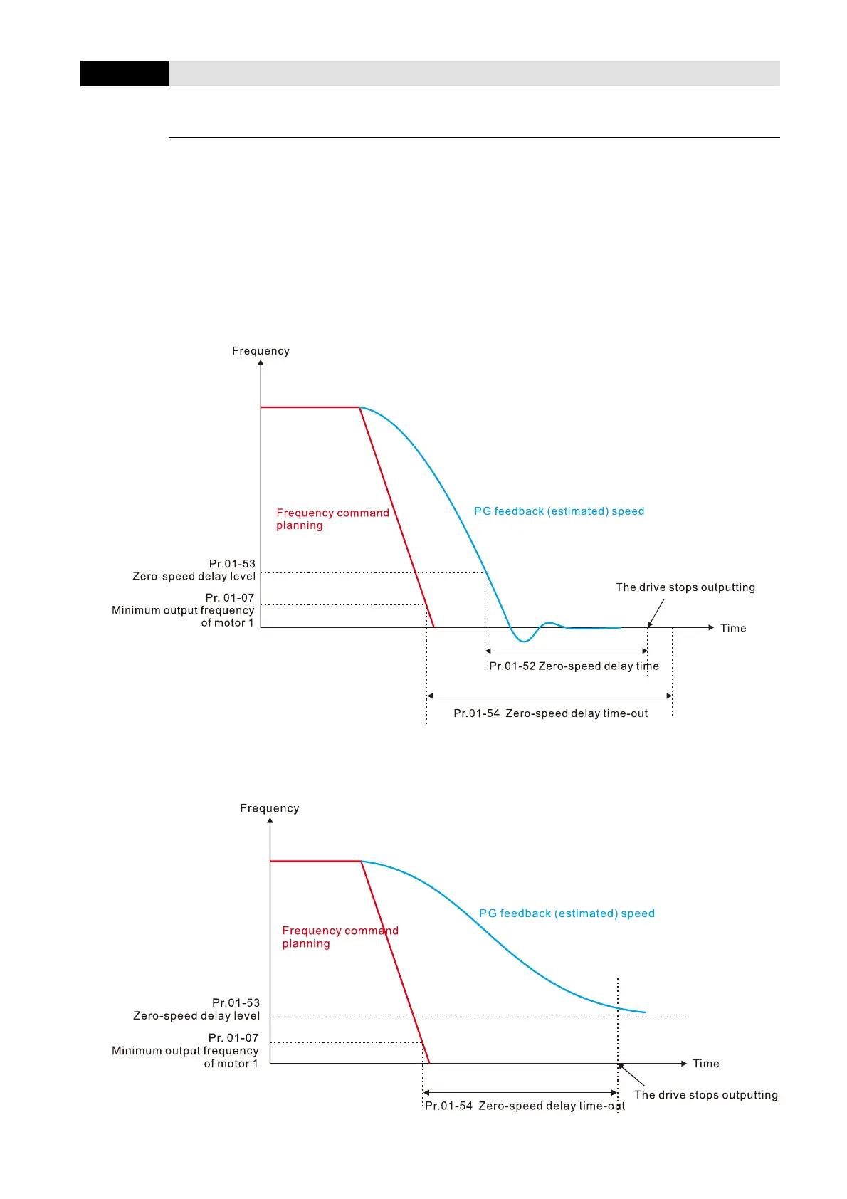The actual motor speed reaches the Pr.01-53 level in Pr.01-54 setting time, and the drive stops