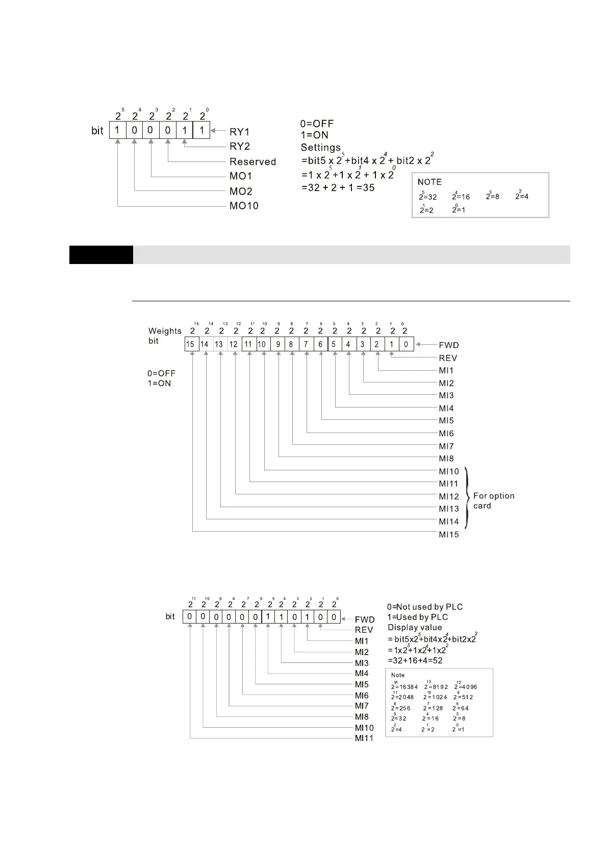 When Pr.02-52 displays 0034h (hex) (that is, the value is 110100 (binary)), it means that MI1,