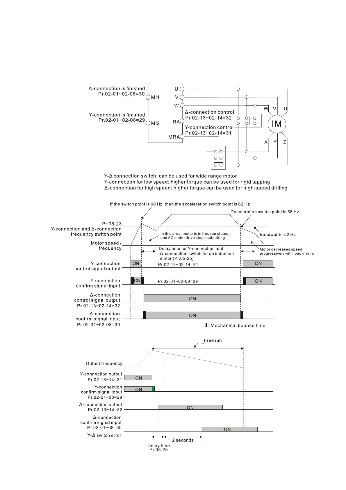 Pr.05-25 sets the switch delay time of Y-connection / -connection.