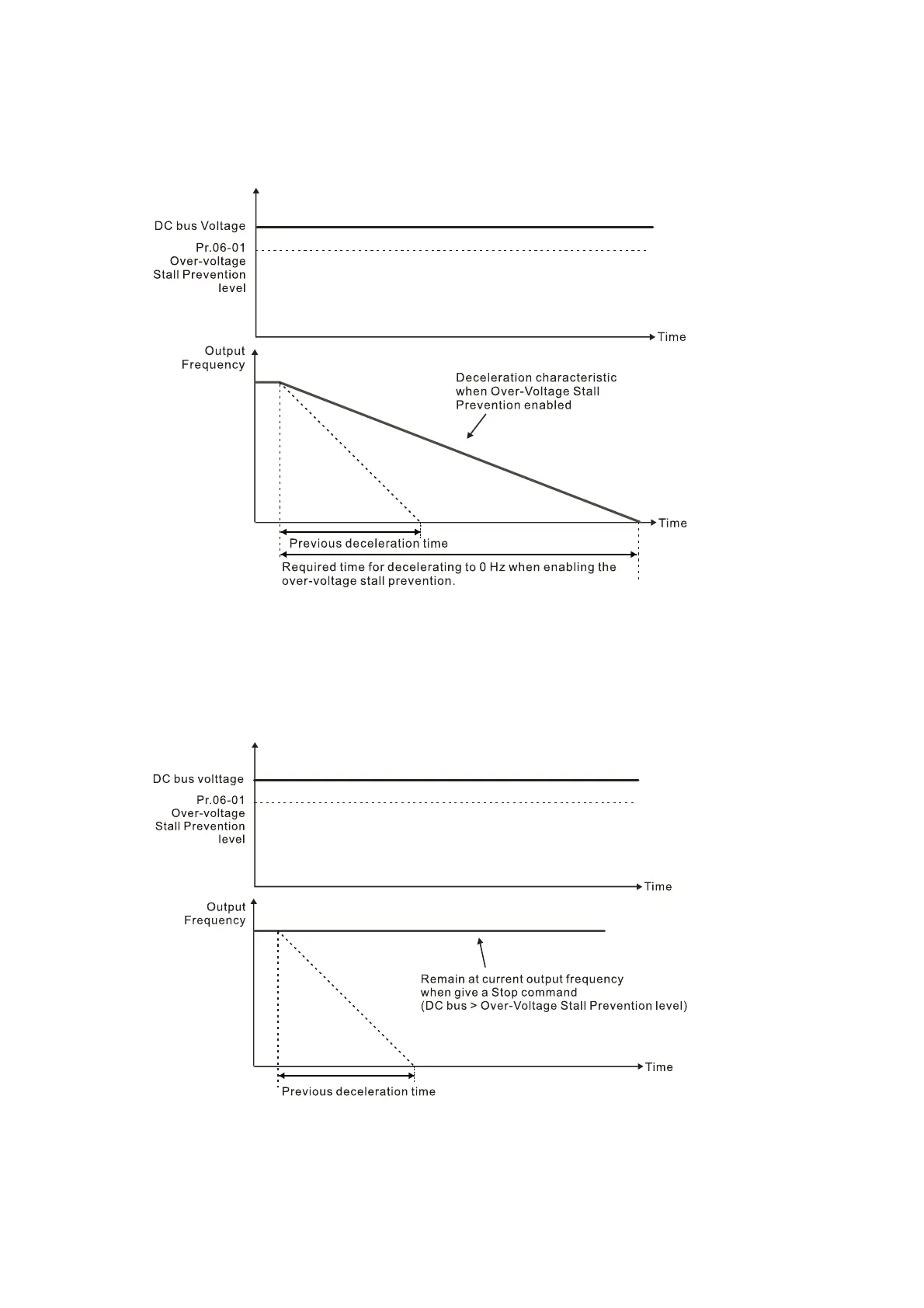 Abnormal condition: DC bus > Pr.06-01 Over-voltage stall prevention