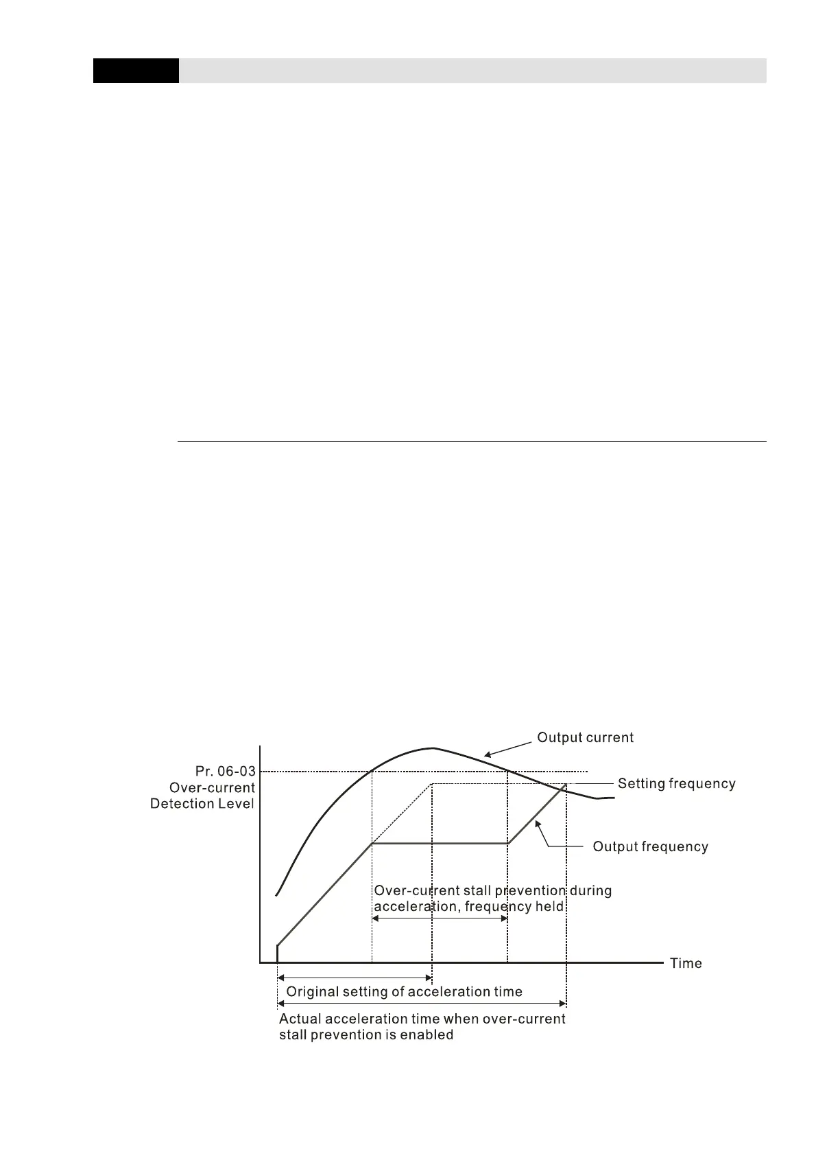 value of Pr.06-03. In this case, the drive stops accelerating and keeps the output frequency