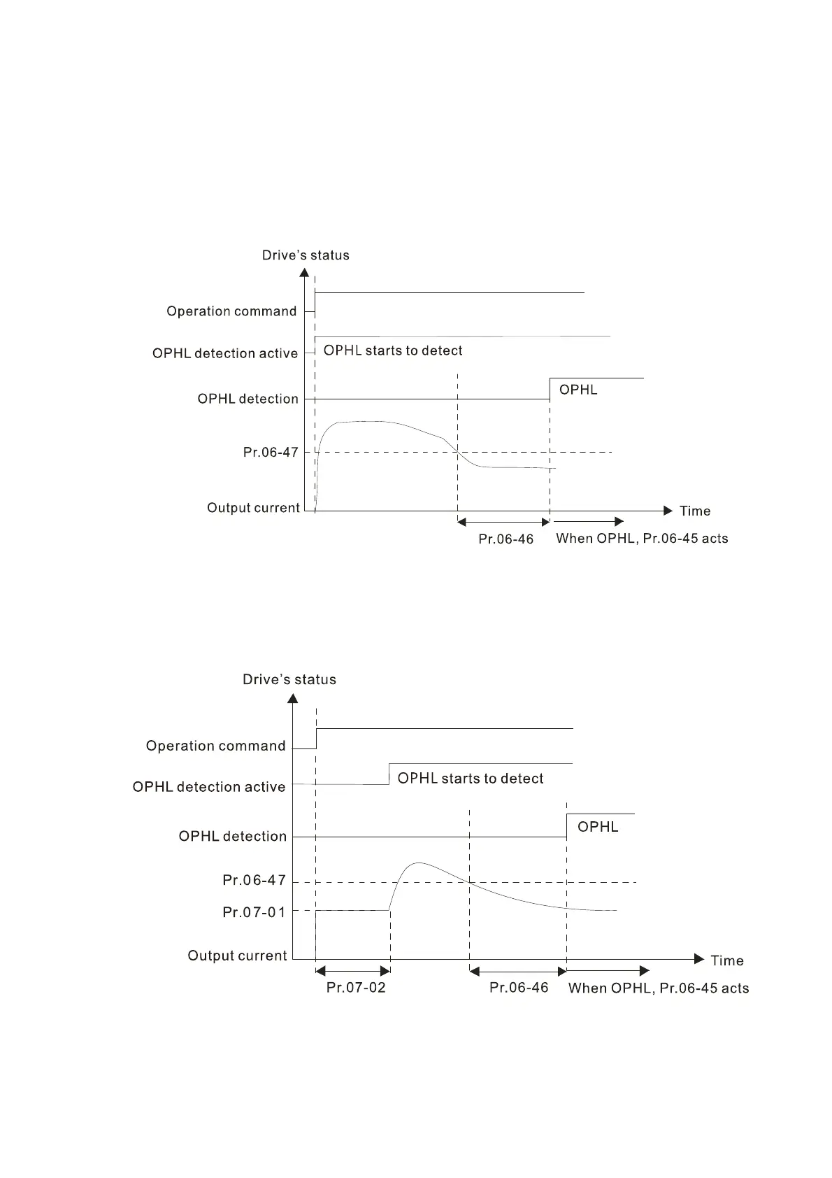 and “detect before operation”. Setting Pr.06-48 to 0 disables the OPHL detection function before