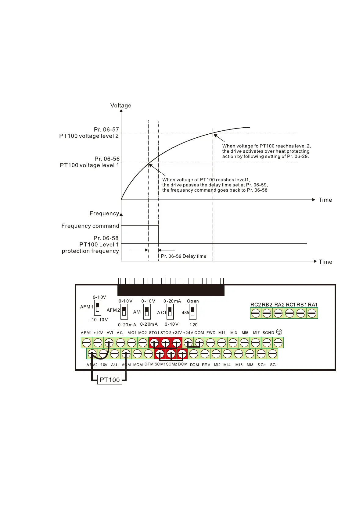 When Pr.06-58 = 0.00 Hz, PT100 function is disabled.