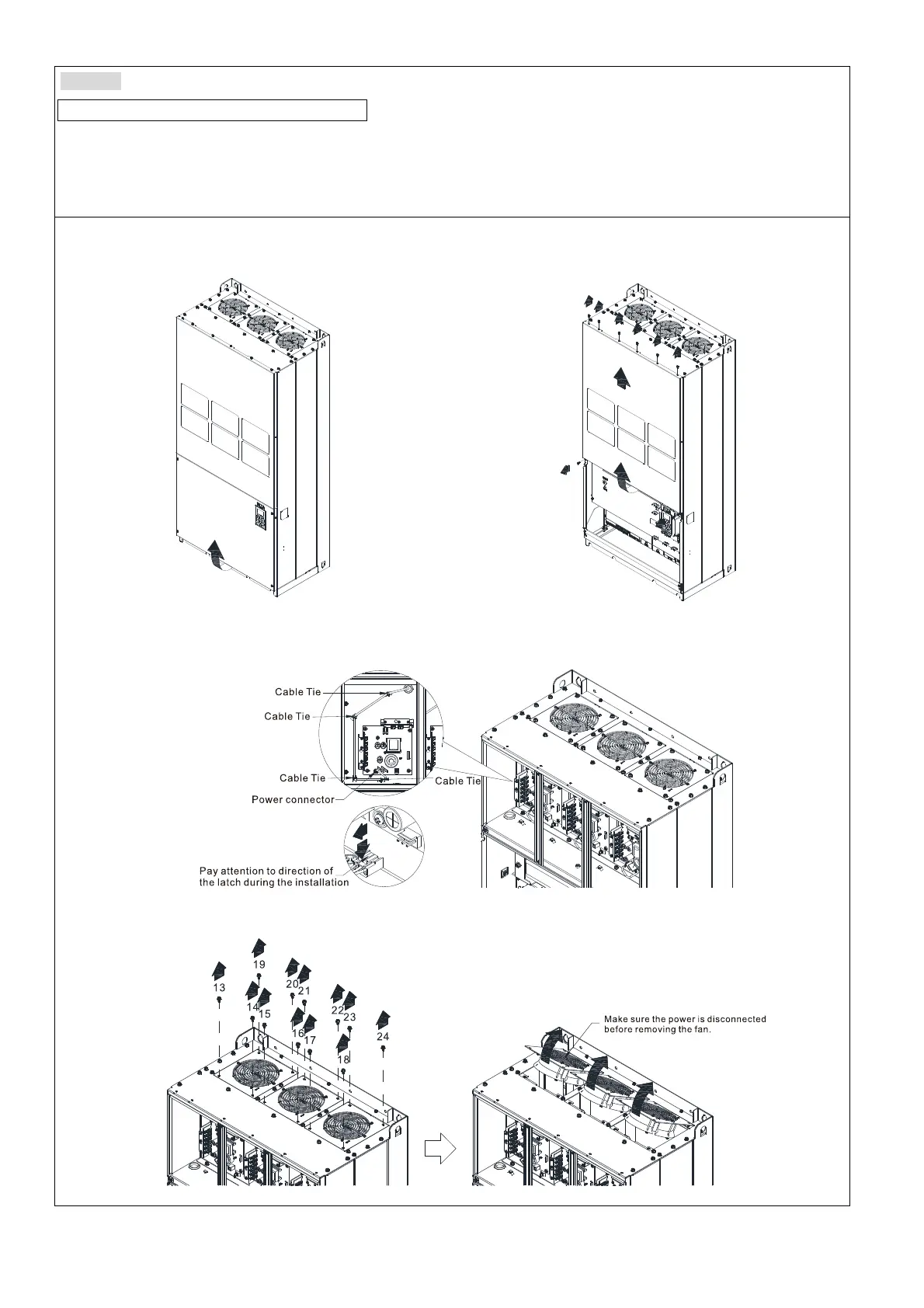 3. Press the latch to disconnect fan power, and cut the cable tie