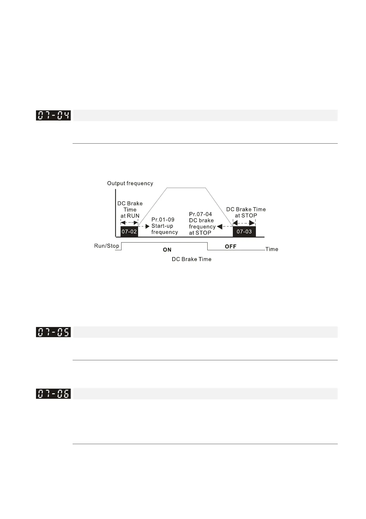 Related parameters: Pr.00-22 Stop Method, Pr.07-04 DC Brake Frequency at STOP.