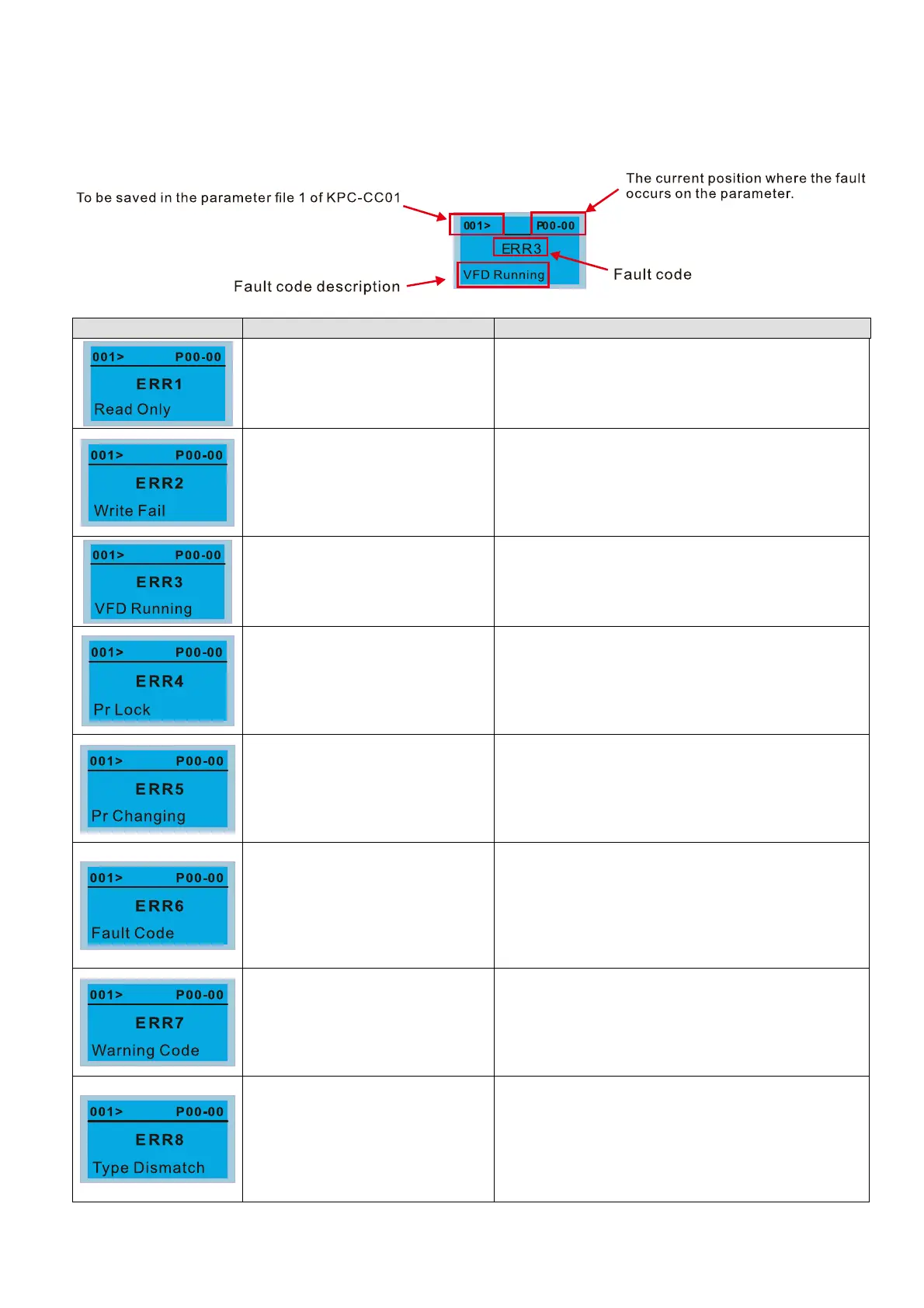 These faults will happen when KPC-CC01 cannot perform the command after clicking the Enter button in