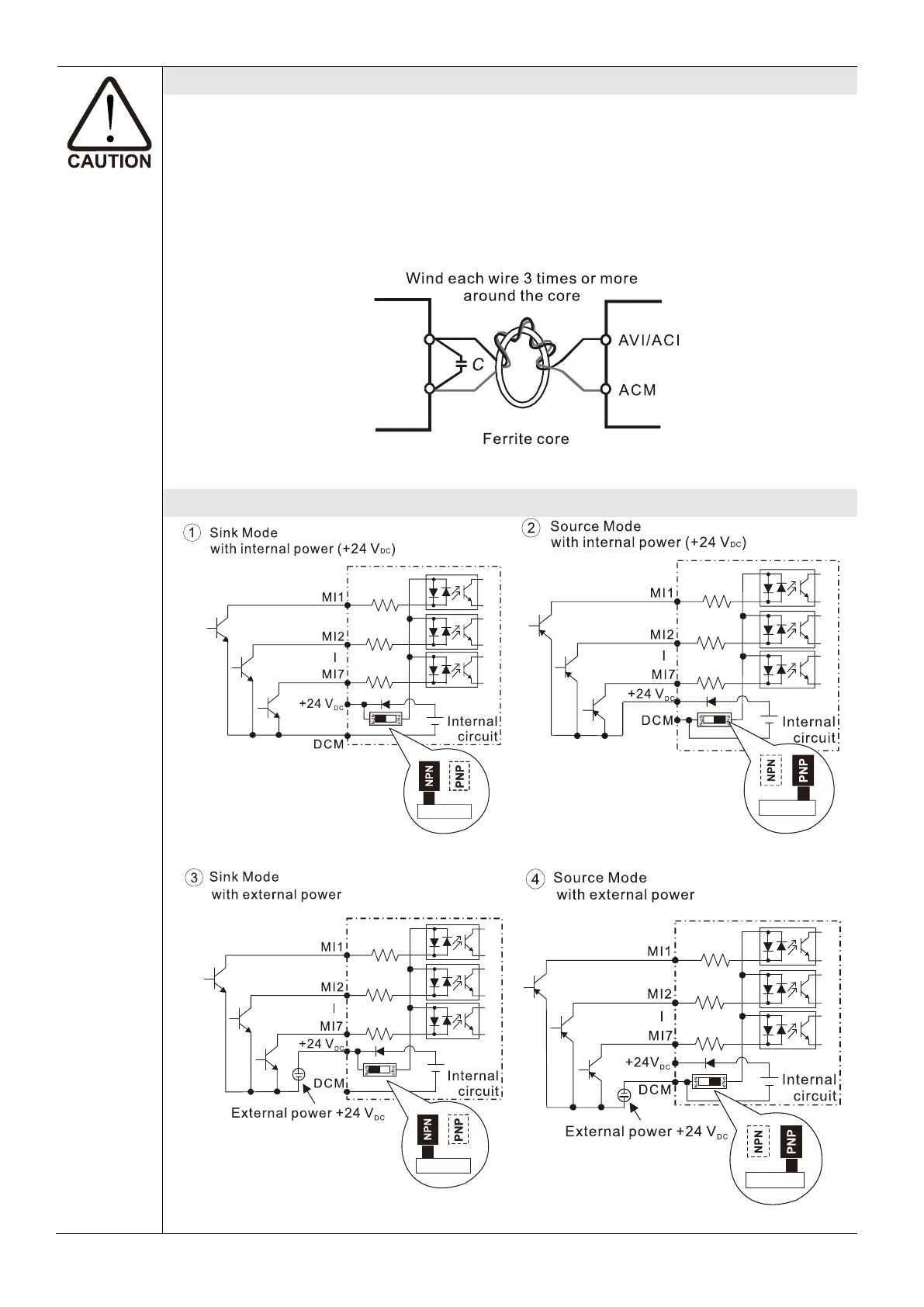 Contact input terminals (MI1–MI7, DCM, +24 V