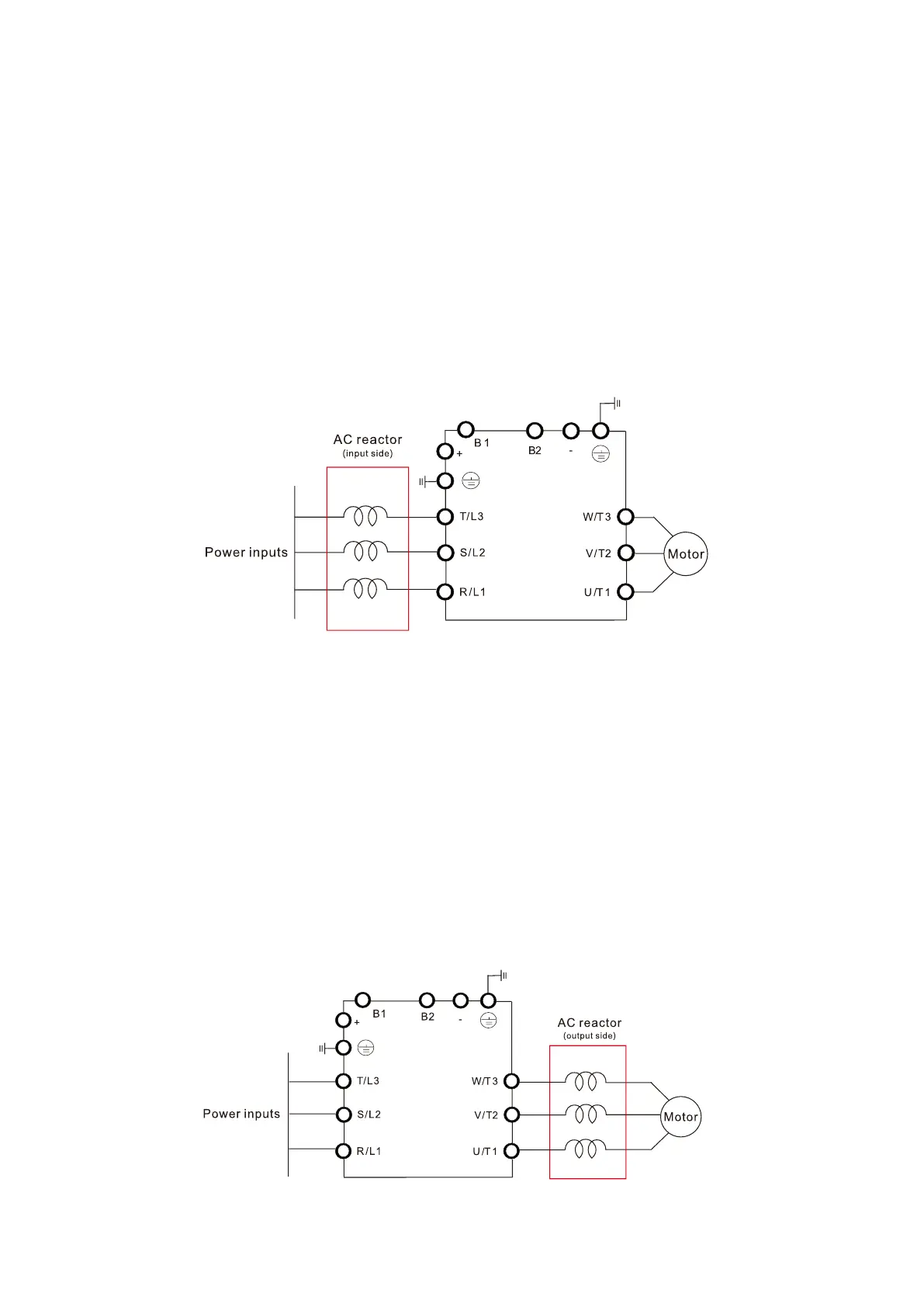 Install an AC input reactor in series between the main power and the three input phases R S T, as shown