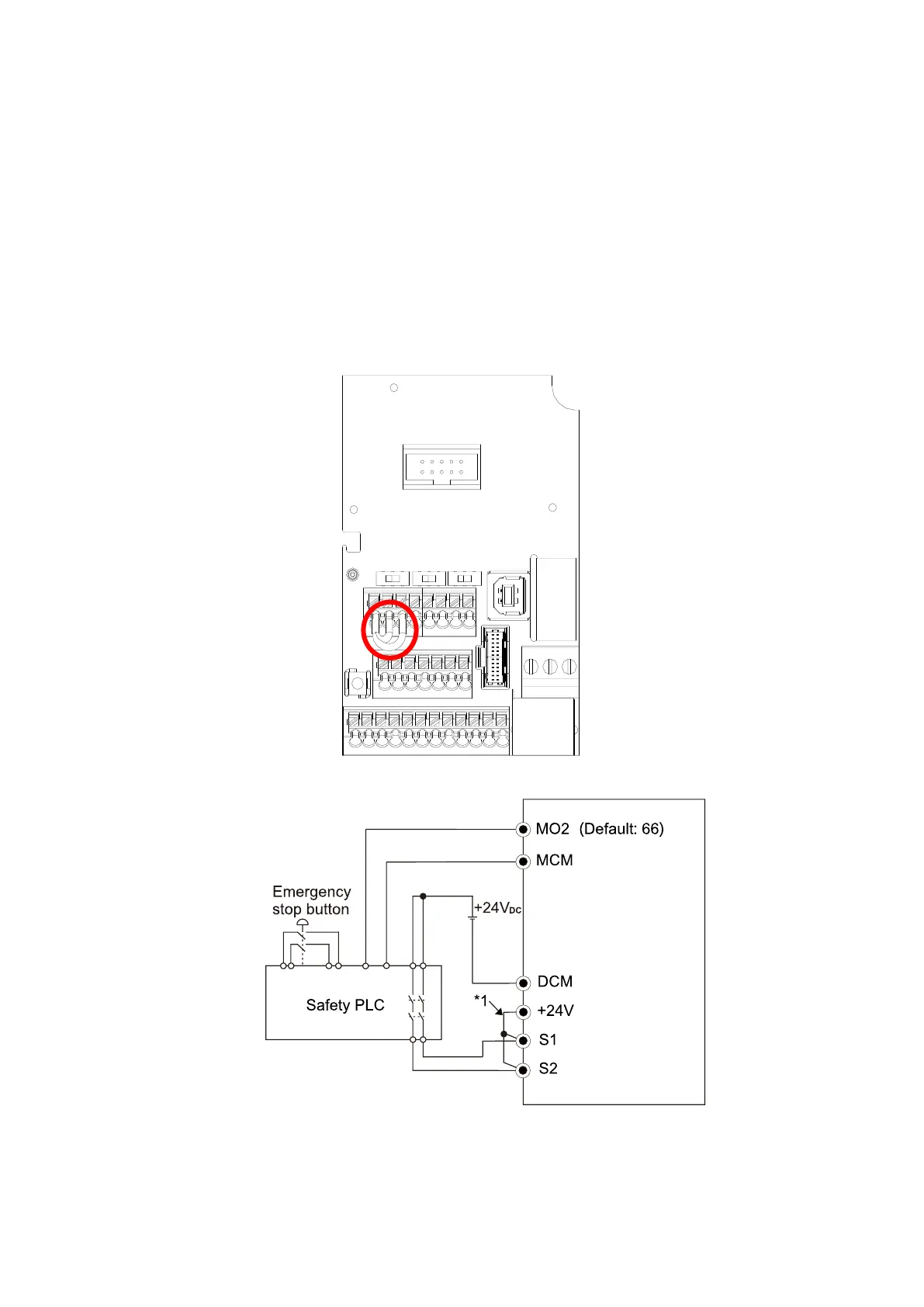*1 is factory jumper wire shorting +24V-S1-S2. To use the Safety function, remove this jumper wire. To