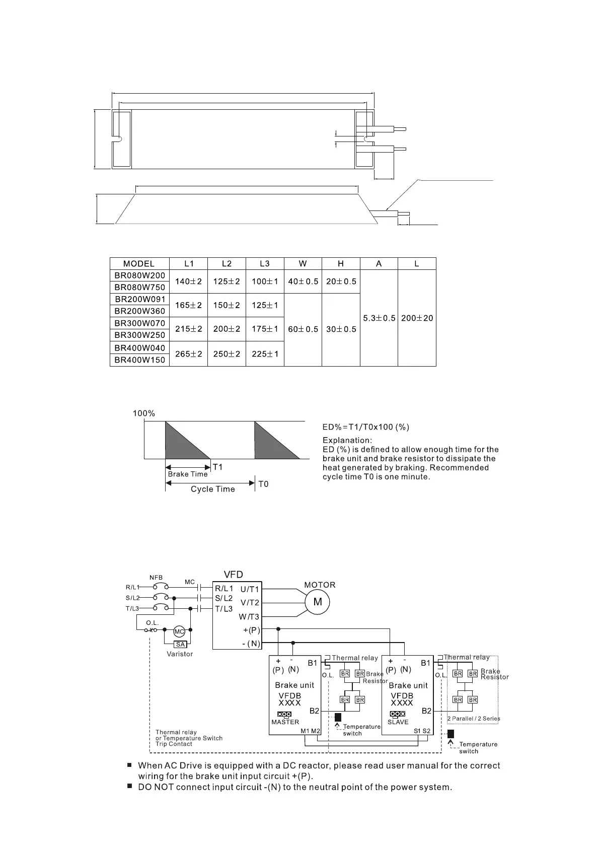 For safety concern, install a thermal overload relay (O.L) between the brake unit and the brake resistor in