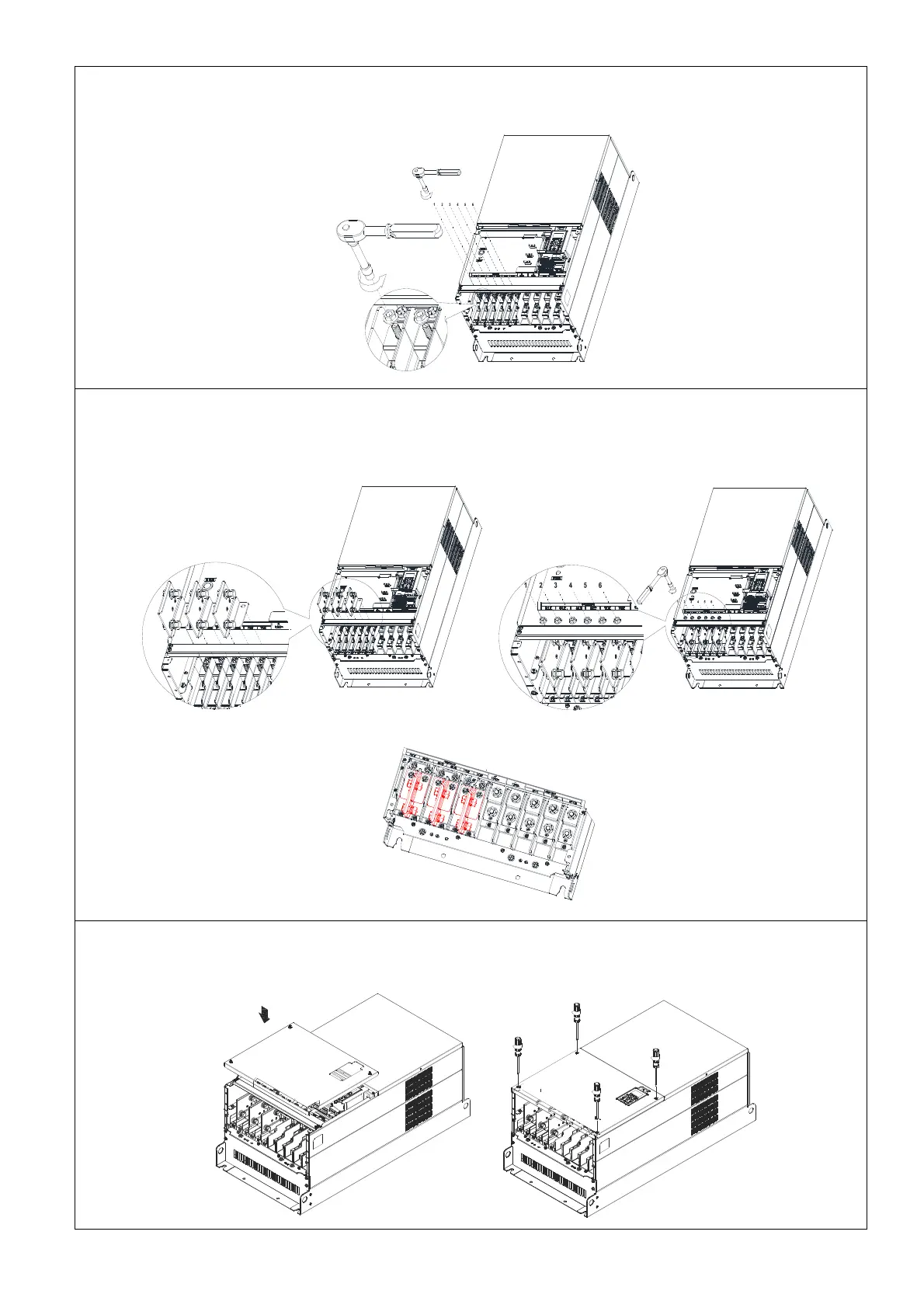 4. Install the 3pcs copper assy., as shown in the following figure 1. Fasten the upper M8 nuts (1–6) with a sleeve