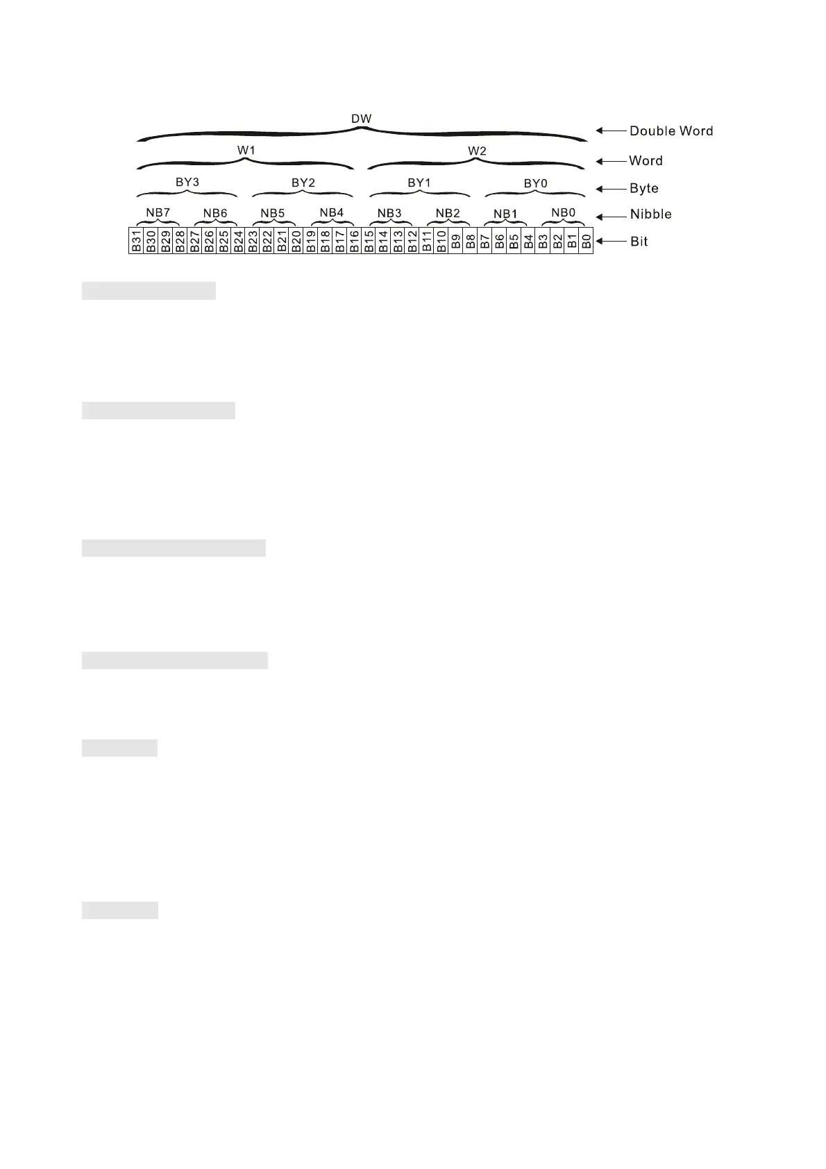 Relationship between bits, digits, nibbles, words, and double words in a binary system (see figure