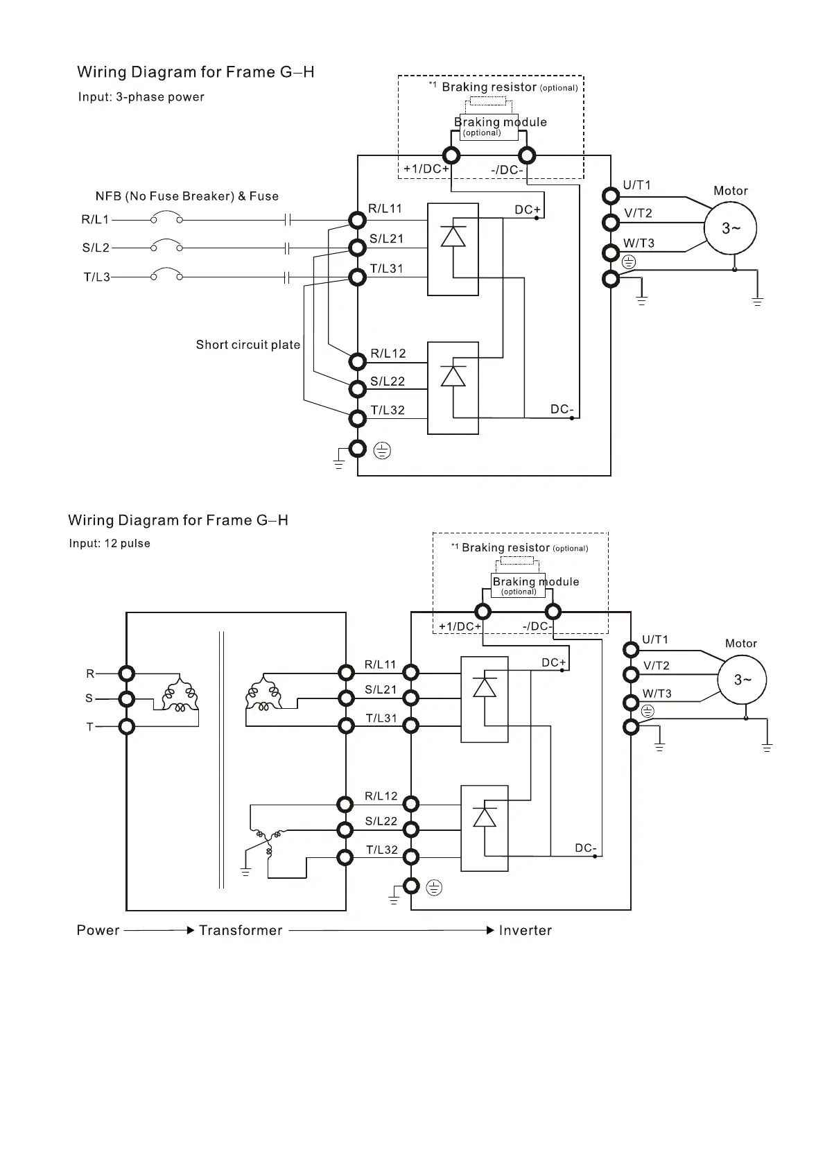 3. Frame G and H models use 12 pulse input, you should remove the short circuit plate (see the figure