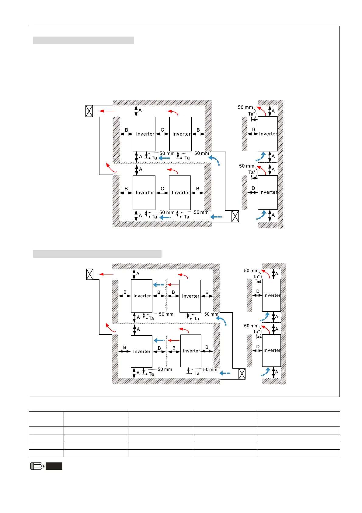 The minimum mounting clearances A–D stated in the table above applies to AC motor drives installation. Failing to