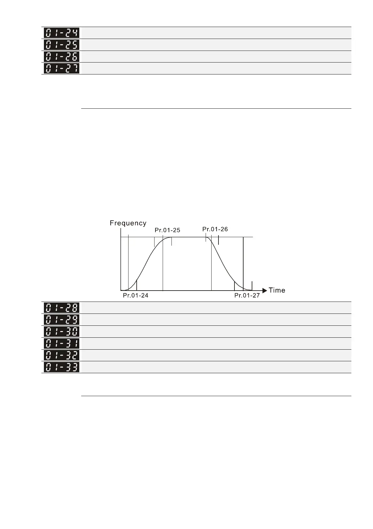 the actual acceleration time = Pr.01-12, 01-14, 01-16, 01-18 + (Pr.01-24 + Pr.01-25) / 2.