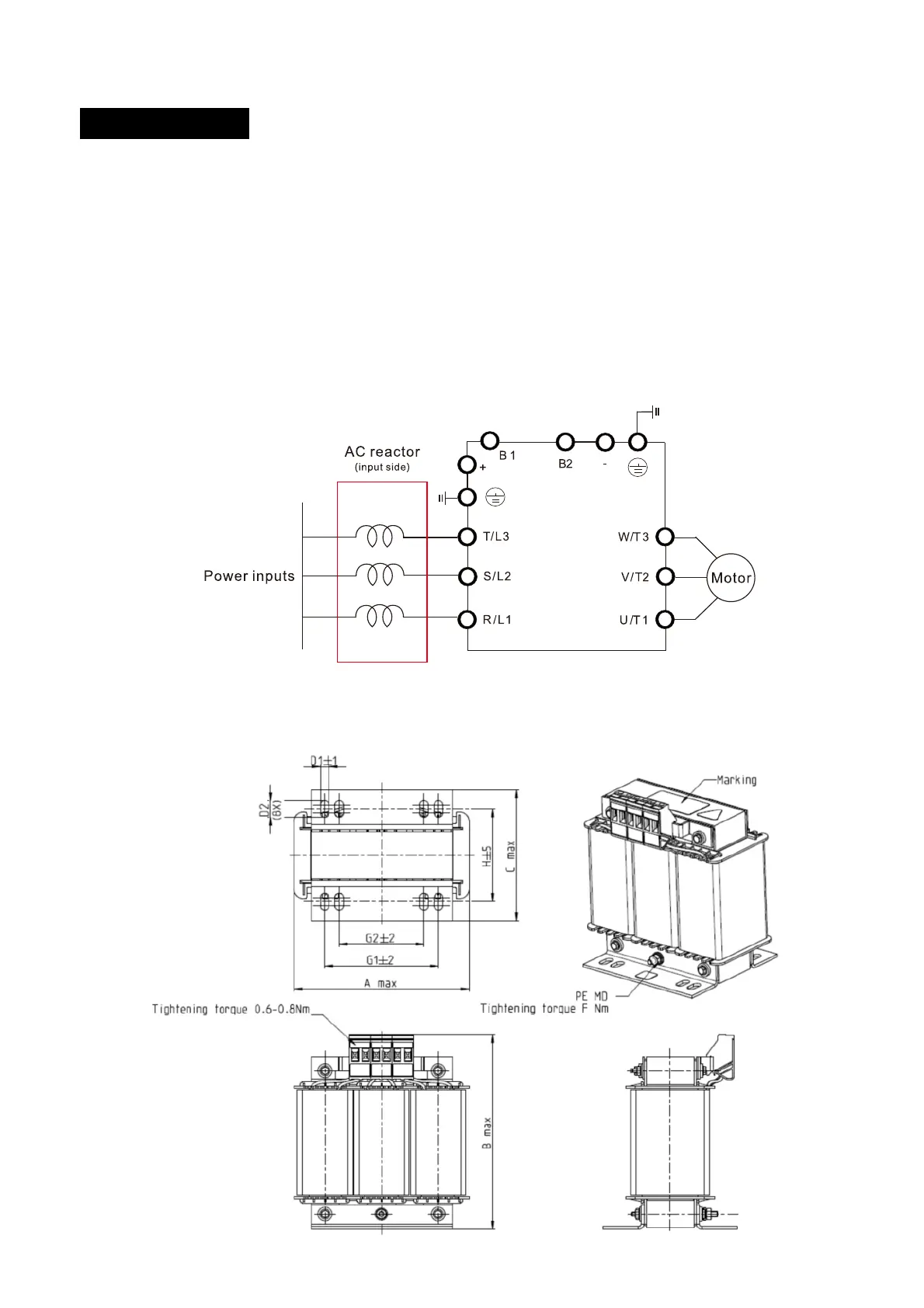 Install an AC input reactor in series with the main power to the three input phases R S T as shown