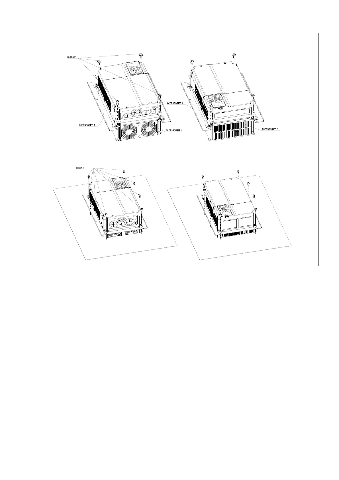 1. Install accessory 1 & 2 by fastening 4 of the screw 1 (M8). Screw torque: 50–55 kg-cm / [43.4–47.7 Ib-in.] /