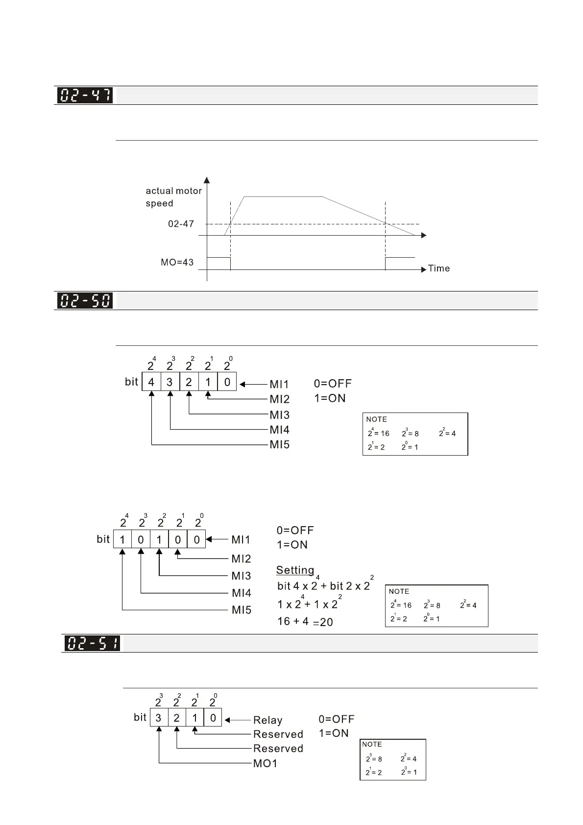 When Pr.02-50 displays 0014h (hex) (that is, the value is 52 (decimal) and 10100 (binary)), it