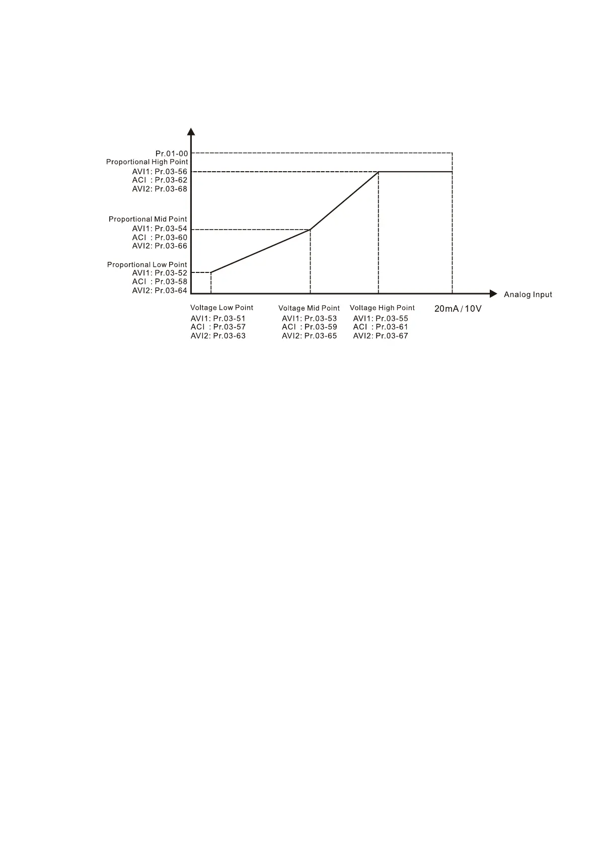 When ACI Selection (Pr.03-29) is 0–10 V, the setting ranges for Pr.03-57, Pr.03-59 and Pr.03-61