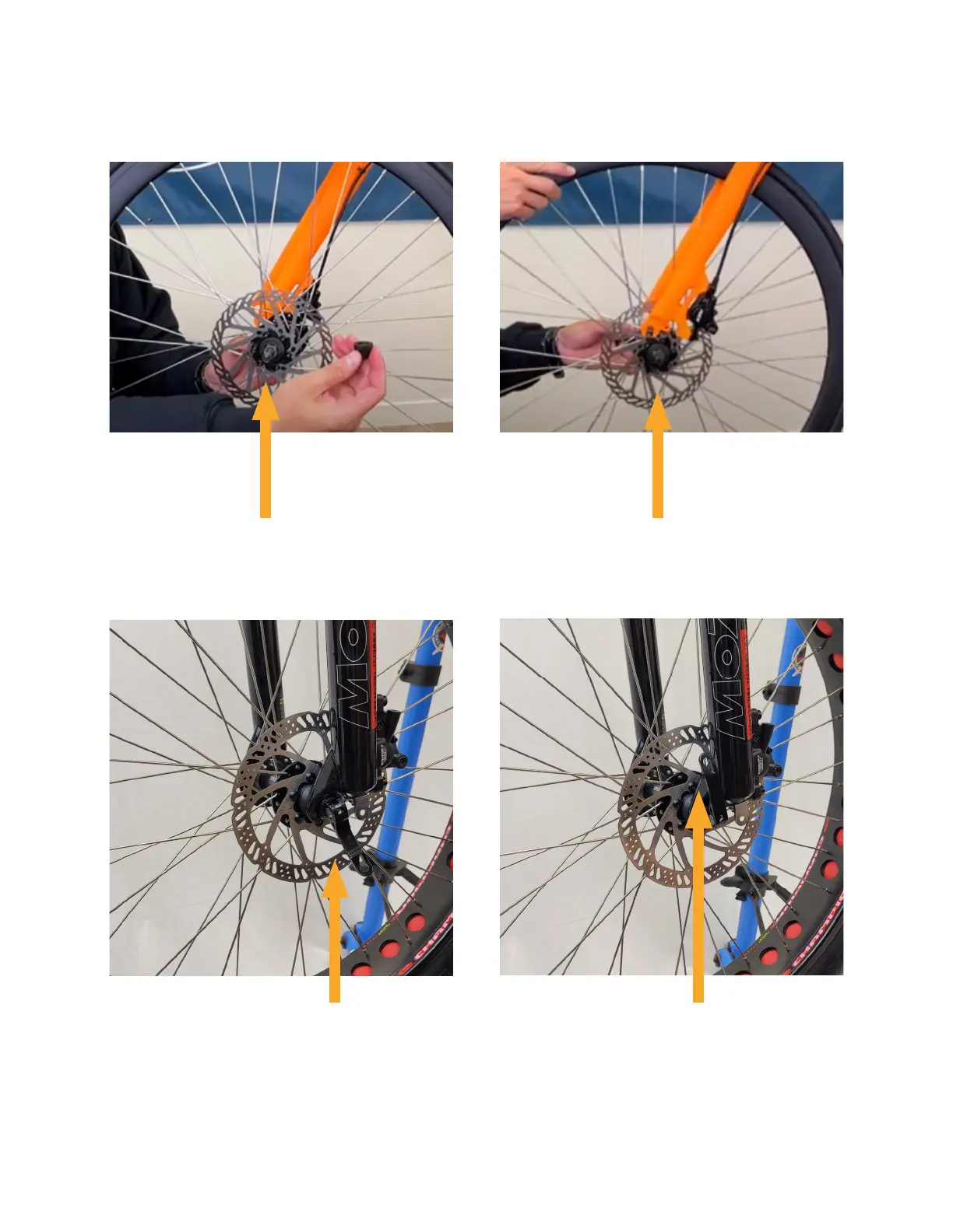 Install the front wheel on the front fork, make sure to align the brake disk with the brake caliper, Avoid