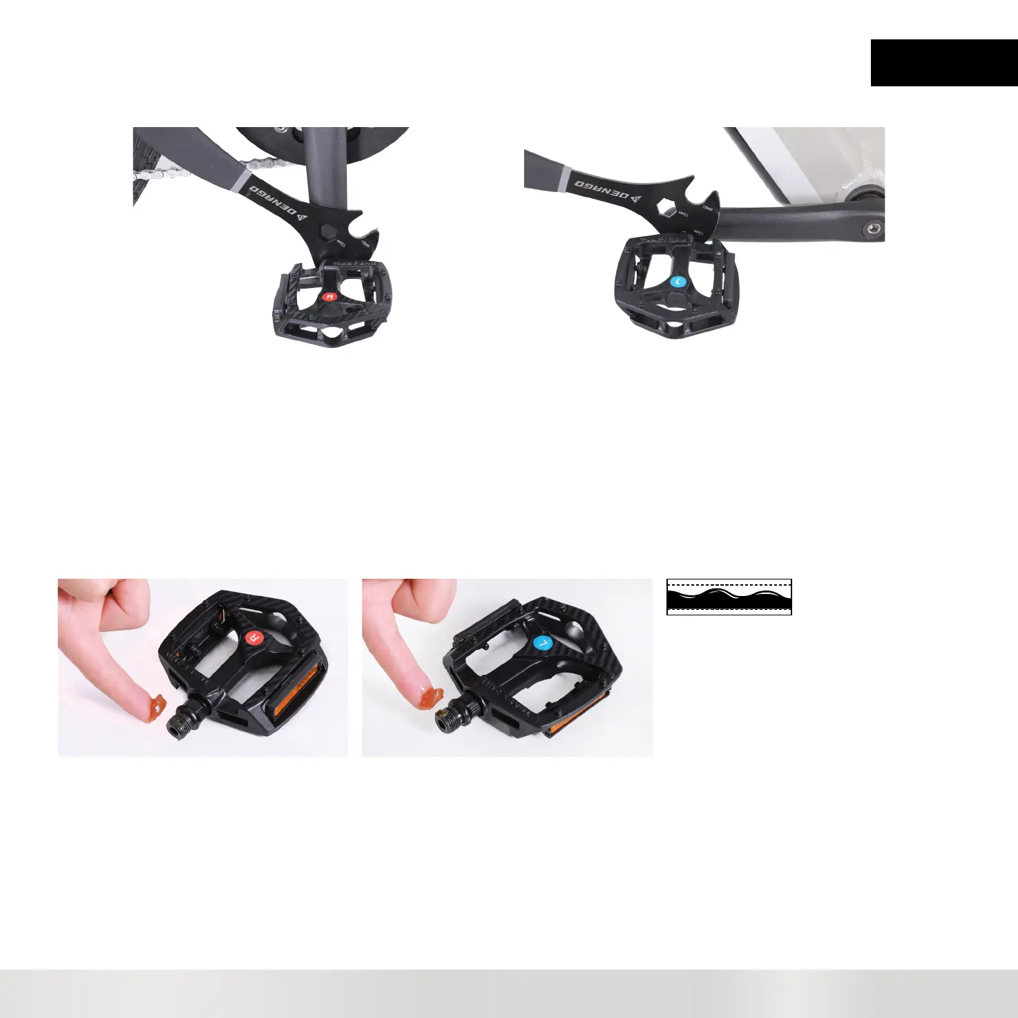 USE PEDAL WRENCH AND CONFIRM PEDALS ARE TIGHTENED AND SECURE
