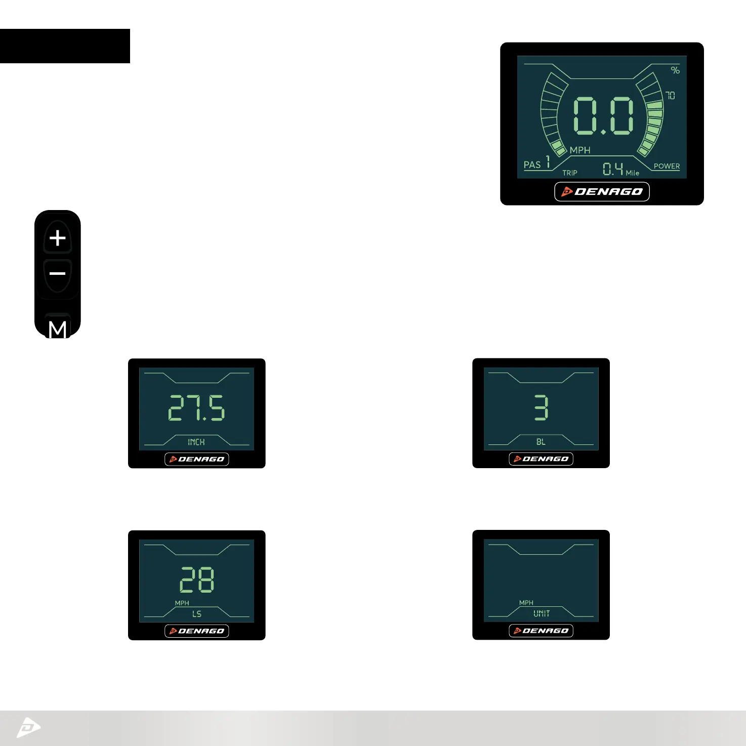 SETTING 1 – inCH: Wheel size setting.