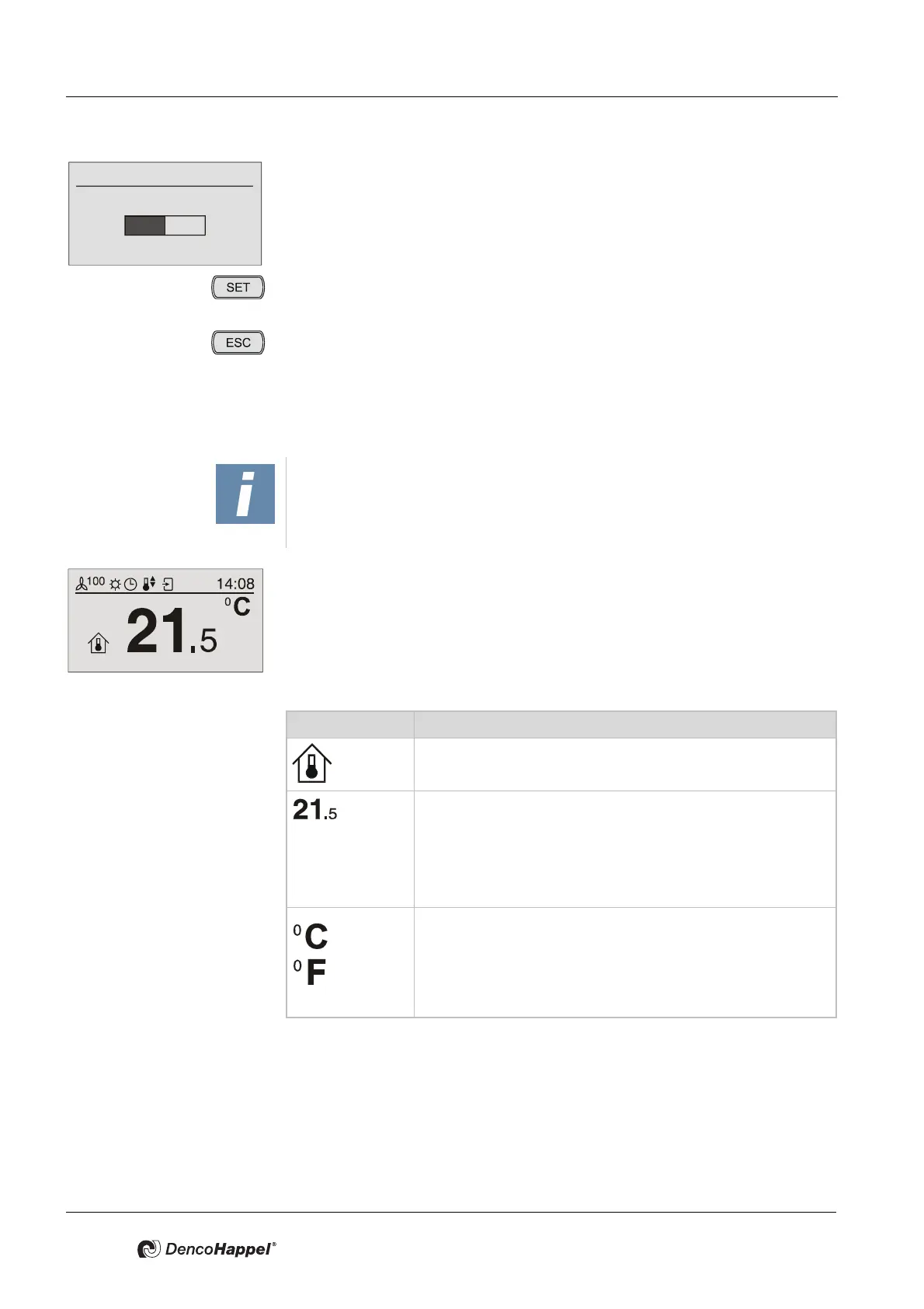 • Change the room temperature setpoint as described in "Changing values" on