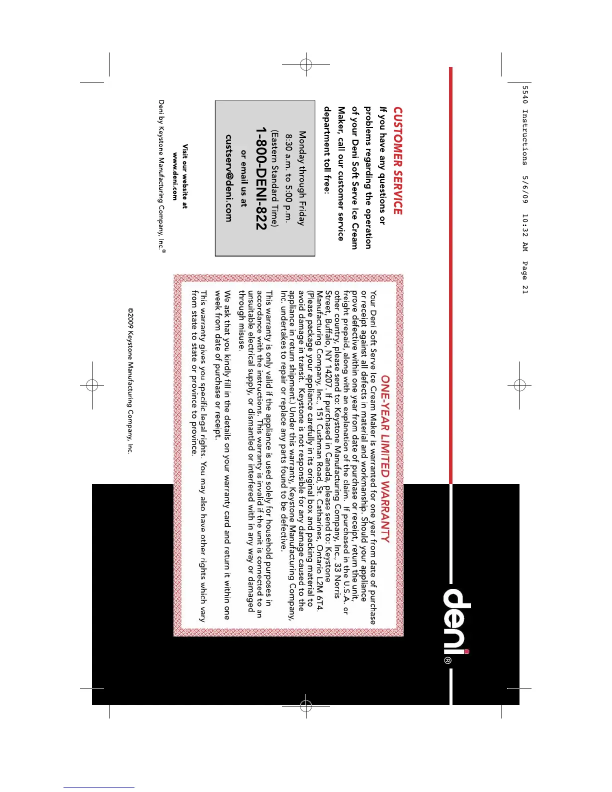 Deni Soft Serve - CUSTOMER SERVICE AND WARRANTY INFORMATION; Contacting Deni Customer Service; One-Year Limited Warranty Details