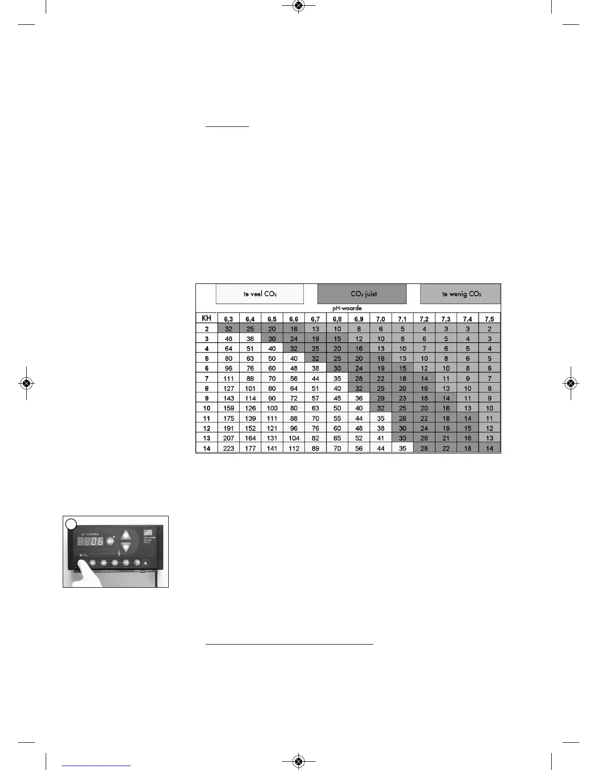 De pH-Con trol ler stelt au to ma tisch de pH 7,0 in (= 20 mg/l CO
