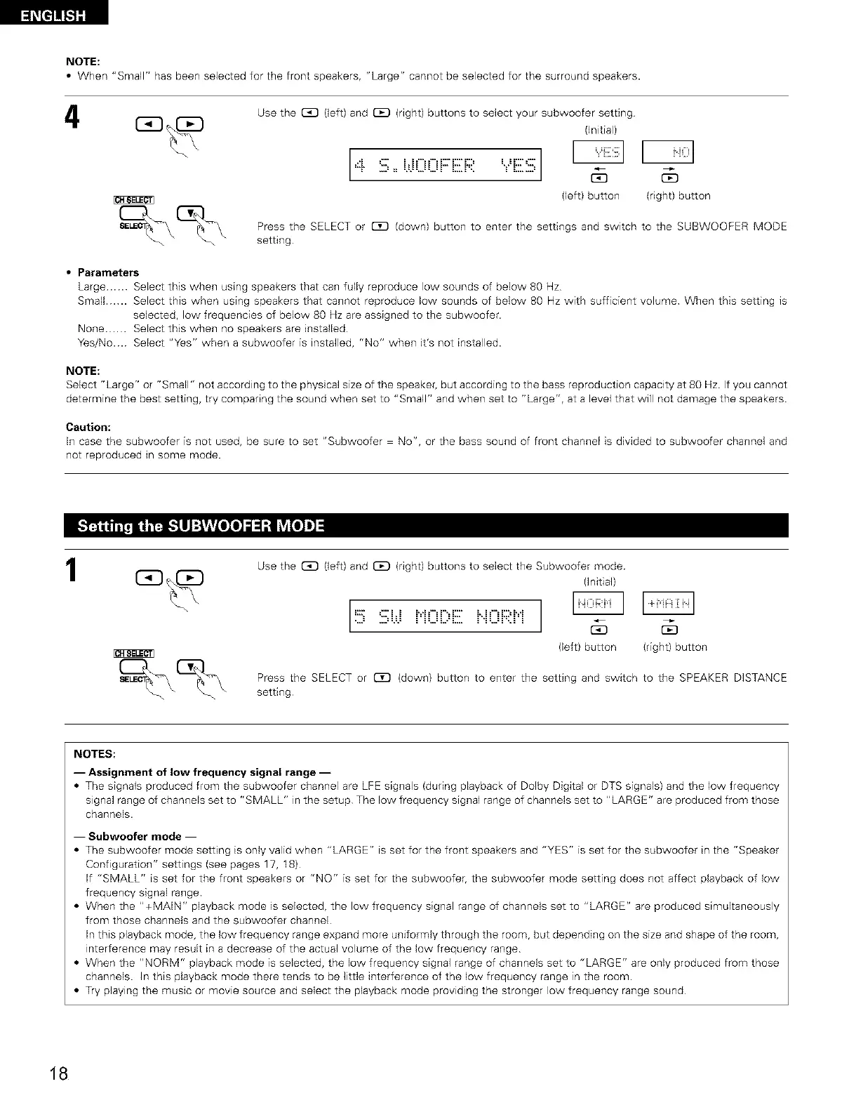 • The subwoofer mode setting is only valid when "LARGE" is set for the front speakers and "YES" is set for the subwoofer in the "Speaker