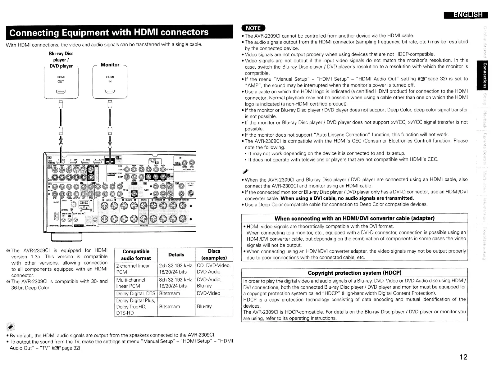 • The audio signals output from the HDMI connector (sampling frequency, bit rate, etc.) may be restricted