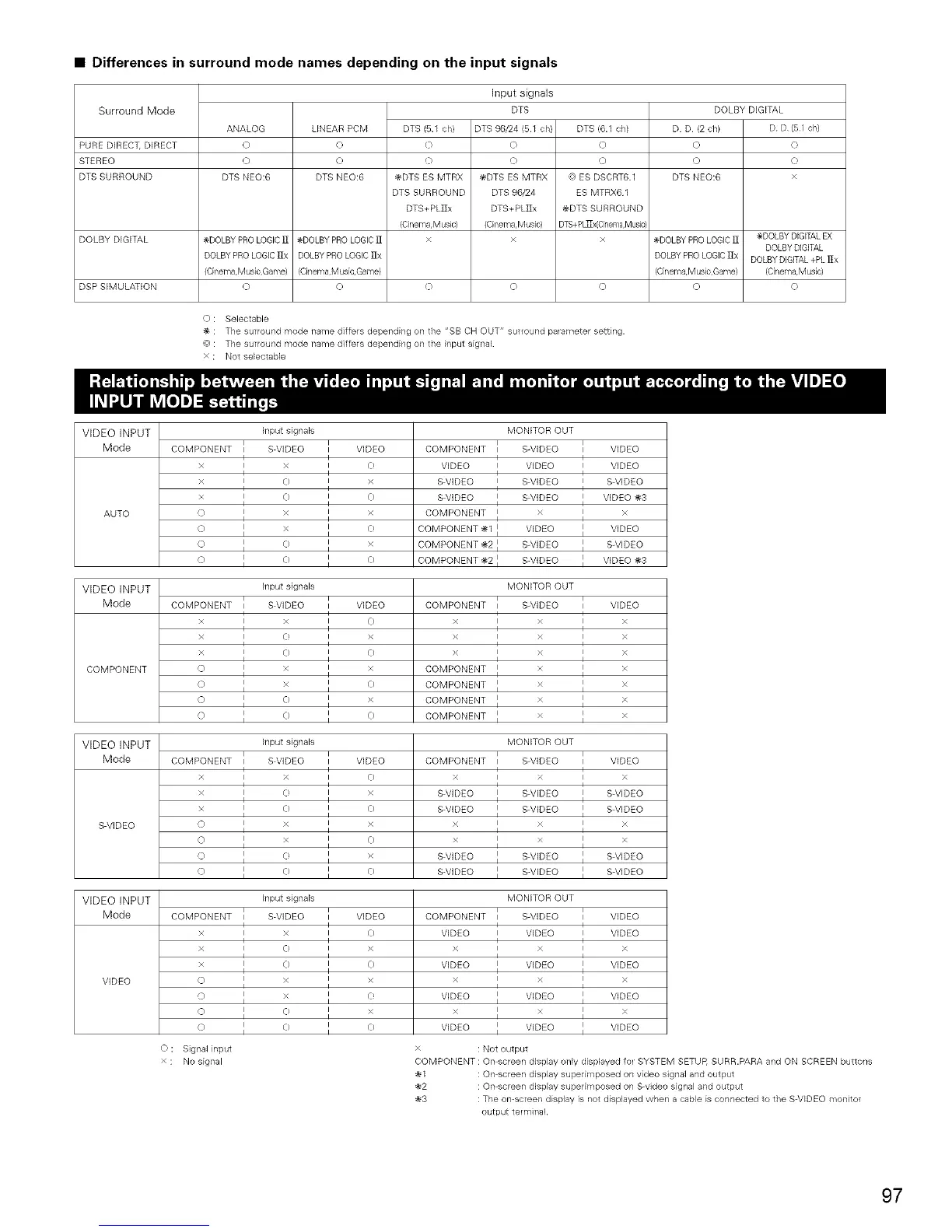 x : No signal COMPONENT : On screen display only displayed for SYSTEM SETUP, SURR.PARA and ON SCREEN buttons