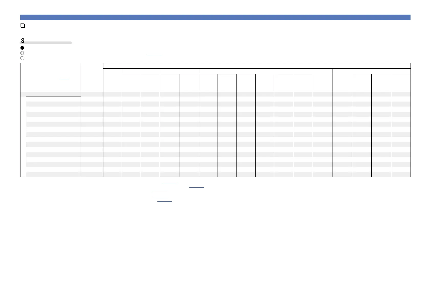 This table shows the input signal that can be played in each surround mode. Check the audio signal of the input source then select the surround mode.