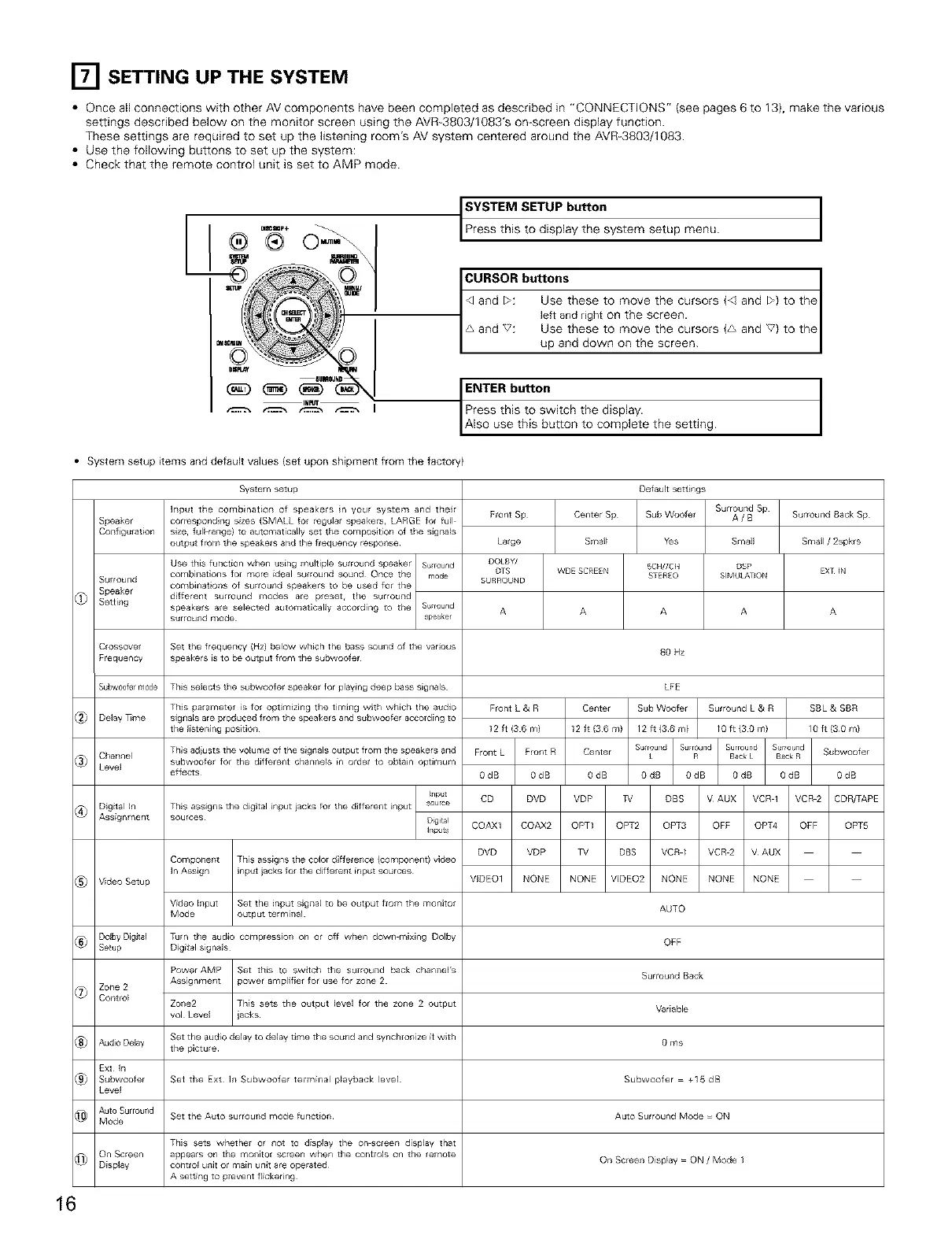 settings described below on the monitor screen using the AVR-3803/1083'S on-screen display function.