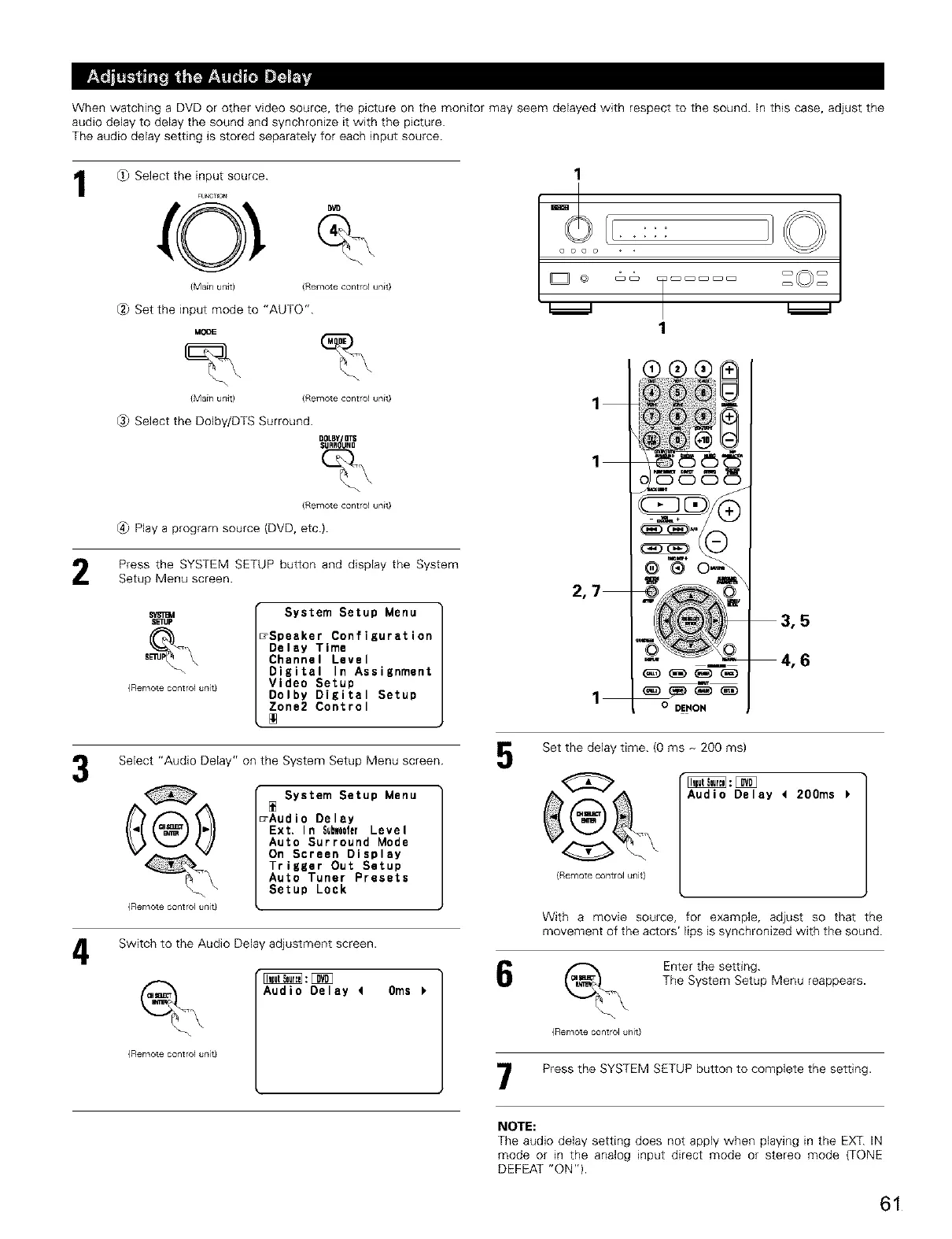 When watching a DVD or other video source, the picture on the monitor may seem delayed with respect to the sound. In this case, adjust the