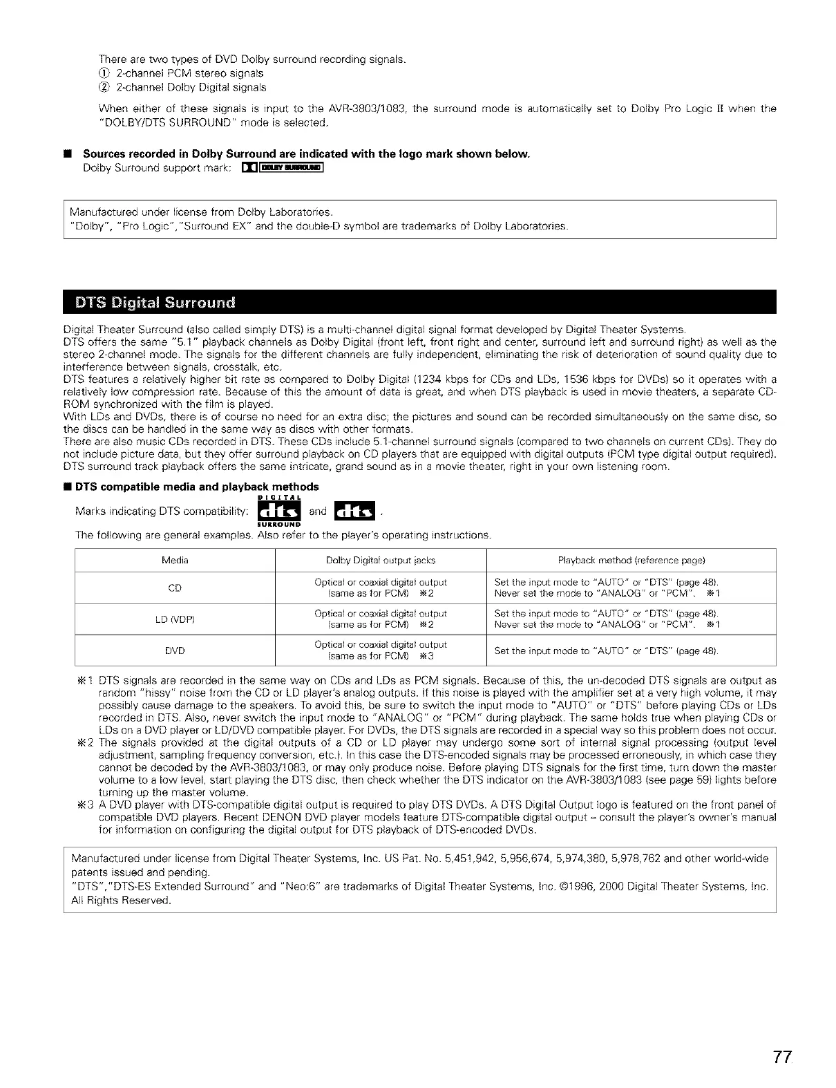 compatible DVD players. Recent DENON DVD player models feature DTS-compatible digital output - consult the player's owner's manual