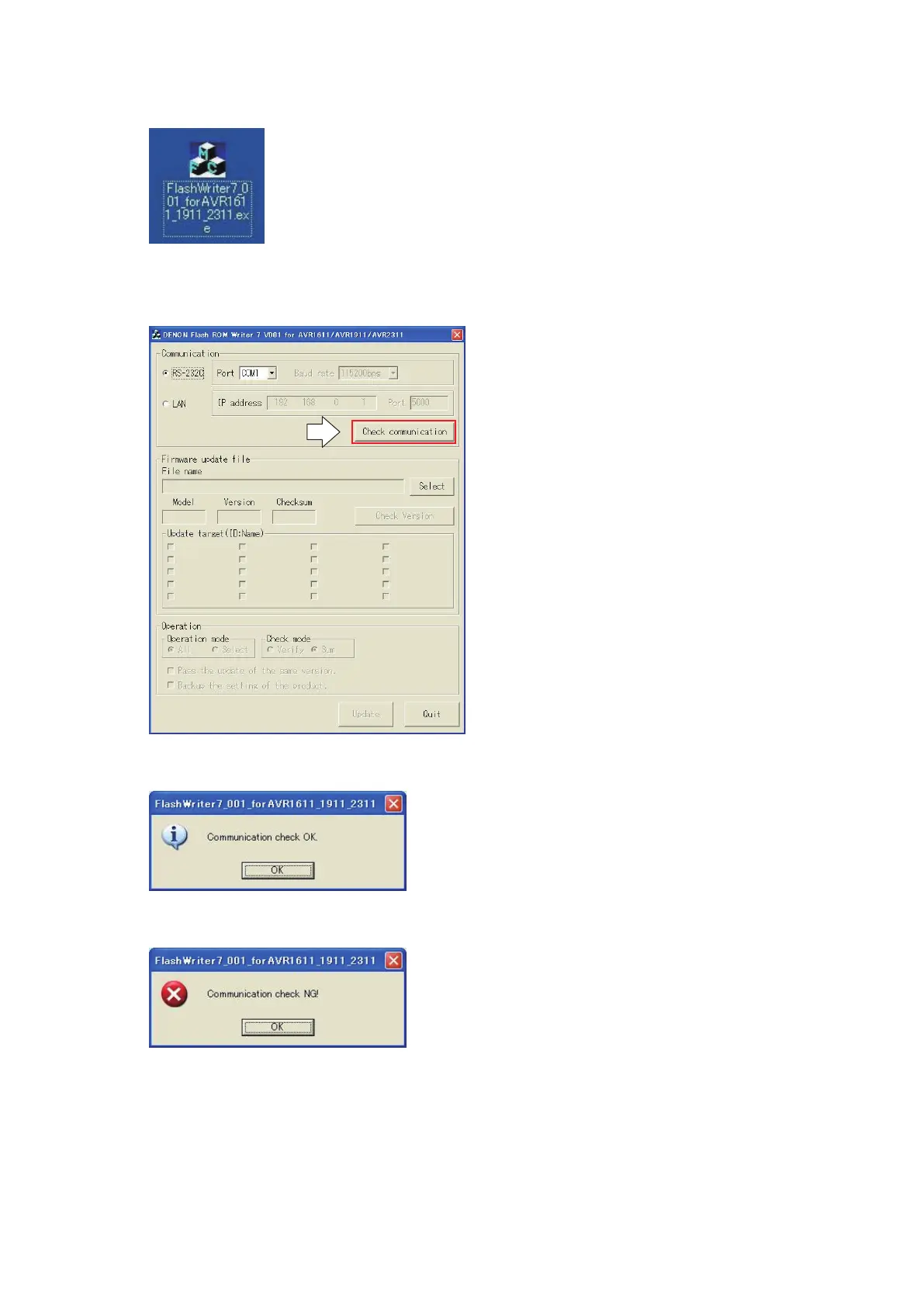 Run the “FlashWriter7_001_forAVR1611_1911_2311.exe” on desktop of PC.