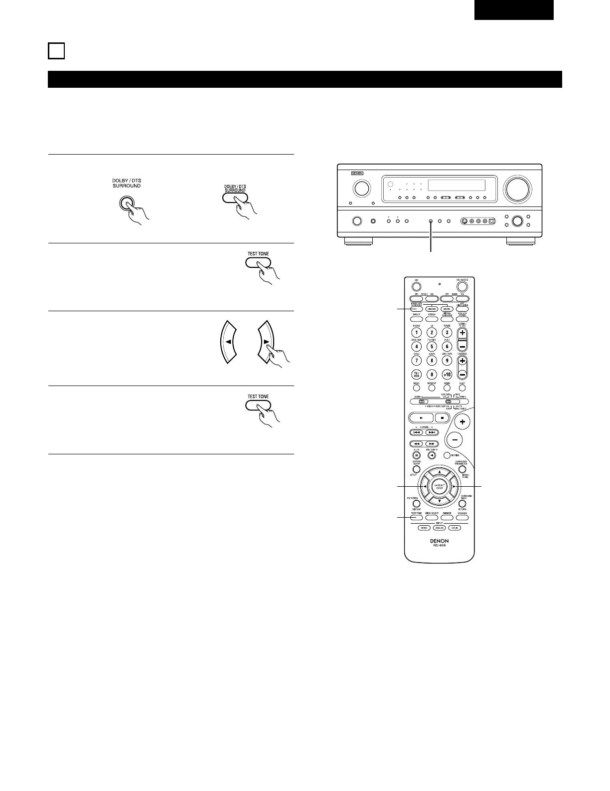 • Les réglages effectués avec les tonalités de test sont valables uniquement avec les modes DOLBY/DTS SURROUND.