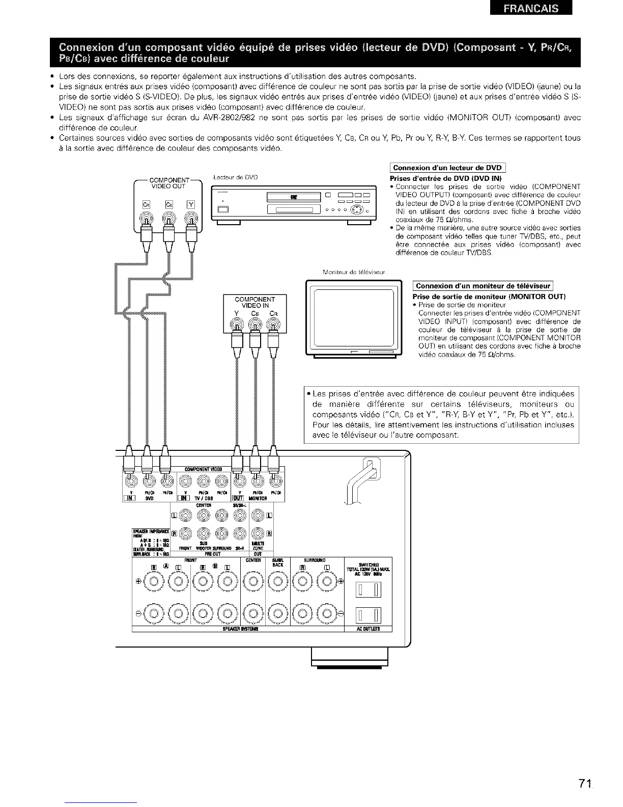 • Les signaux d'affichage sur ecran du AVR-2802/982 ne sont pas sortis par les prises de sortie video {MONITOR OUT) (composant) avec