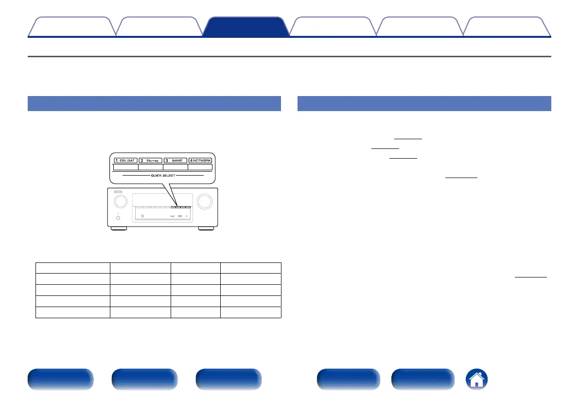 You can save settings such as the input source selection, volume level, and sound mode at the QUICK SELECT 1 – 4 buttons.
