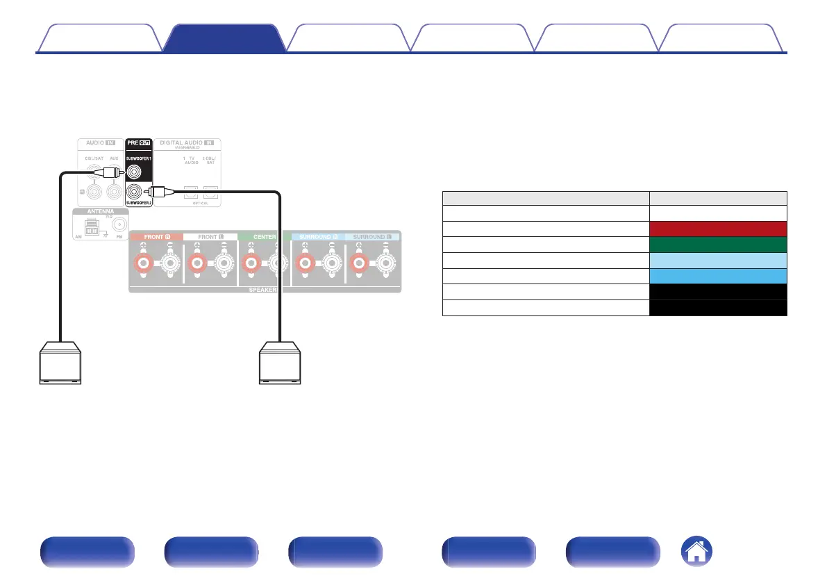 Use a subwoofer cable to connect the subwoofer. Two subwoofers can