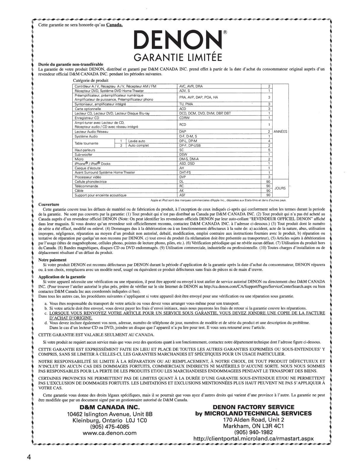 La garantie de votre produit DENON, distribue et garanti par D&M CANADA INC. prend effet a partir de Ia date