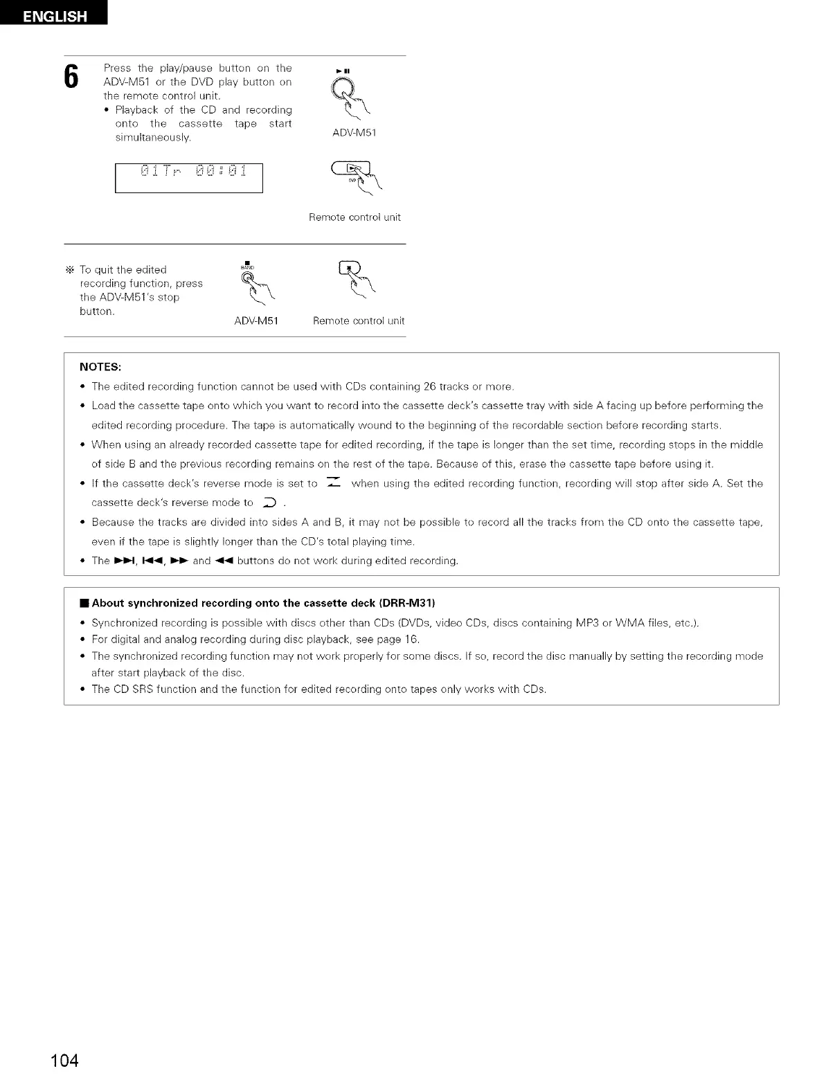 • About synchronized recording onto the cassette deck (DRR-M31)