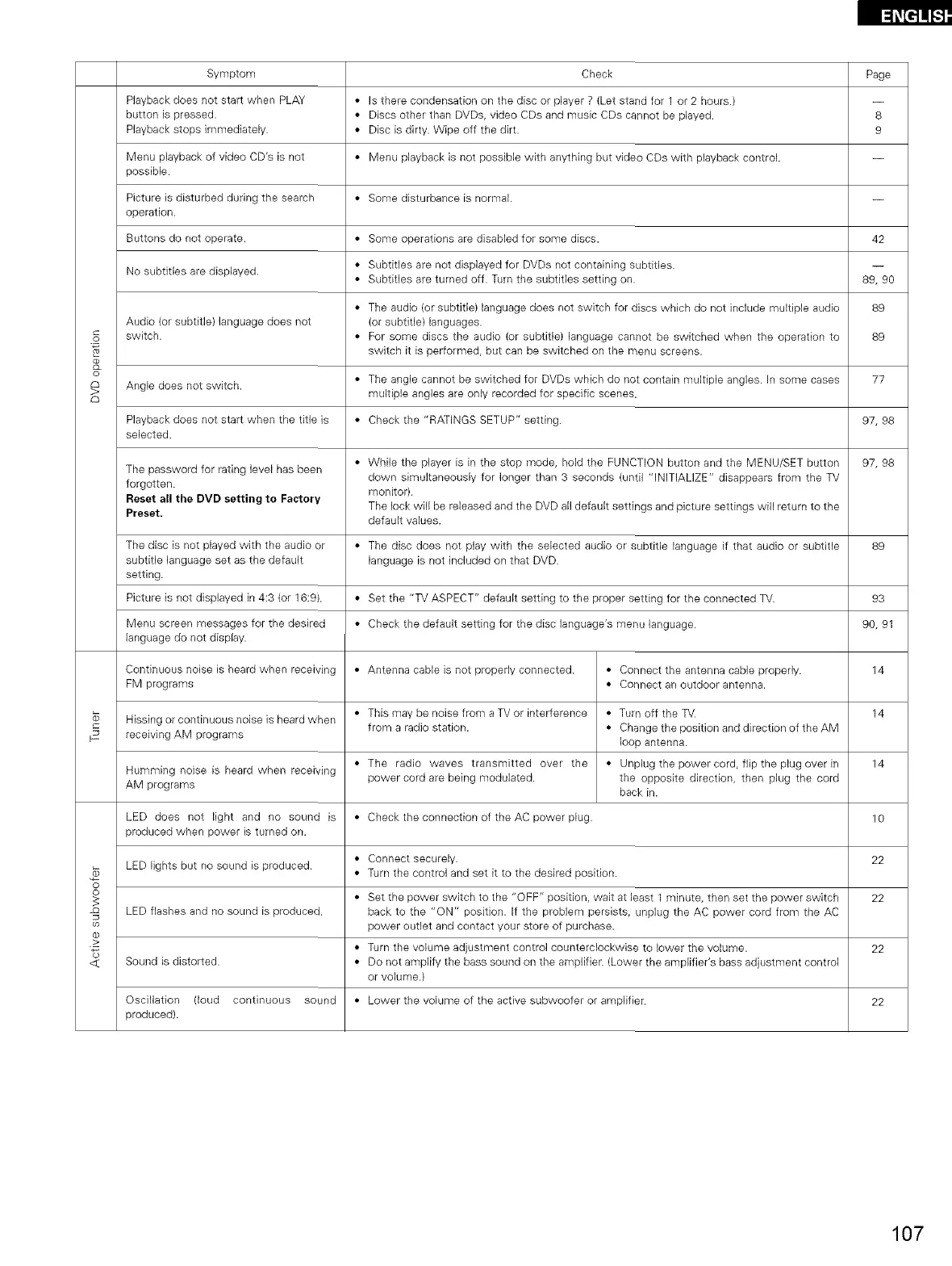 <_ Sound is distorted. • Do not amplify the bass sound on the amplifier. (Lower the amplifier's bass adjustment control