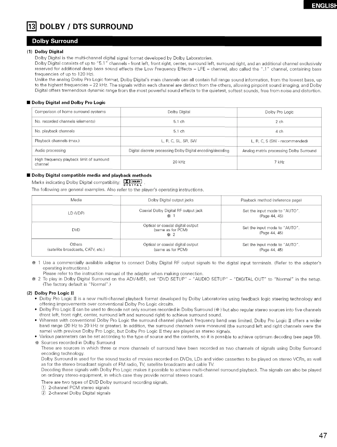 ._ 2 To play in Dolby Digital Surreund on the ADV-M51, set "DVD SETUP" - "AUDIO SETUP" - "DIGITAL OUT" te "Nermal" in the setup.