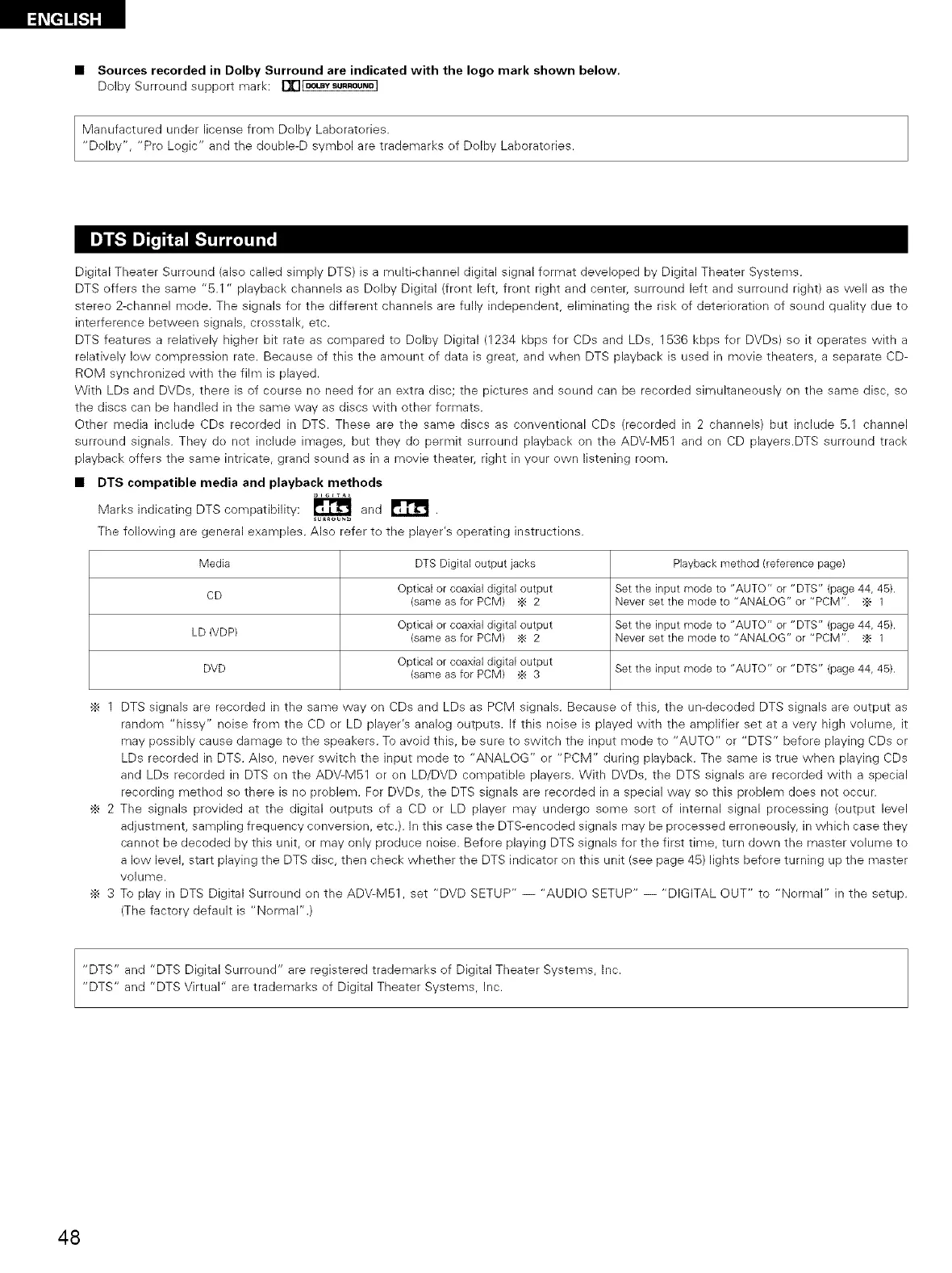 and LDs recorded in DTS en the ADV-M51 er en LD/DVD compatible players. With DVDs, the DTS signals are recorded with a special