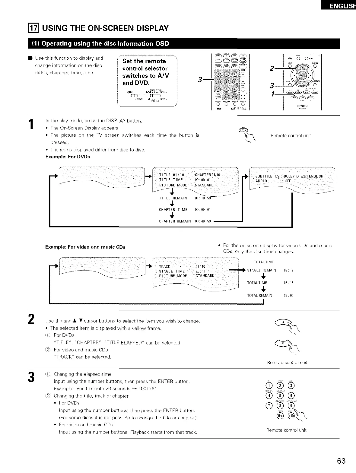 • For the on-screen display for video CDs and music