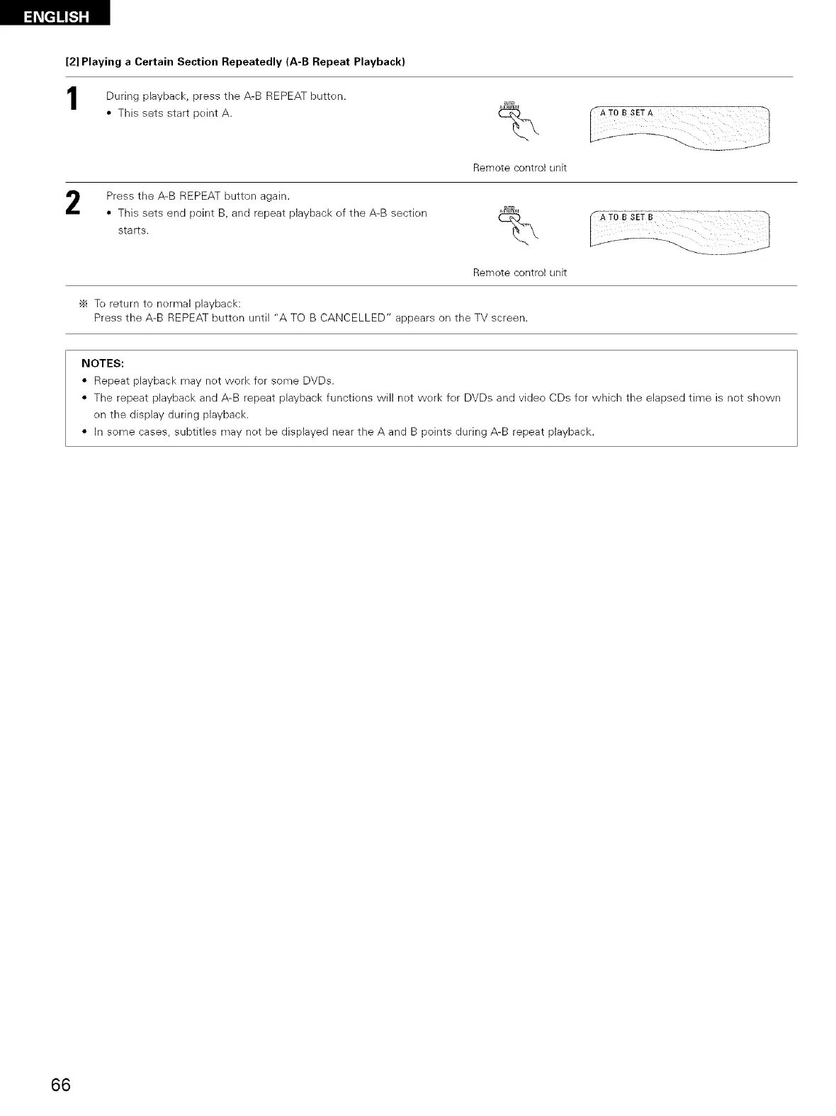 Press the A-B REPEAT button until "A TO B CANCELLED" appears on the TV screen.
